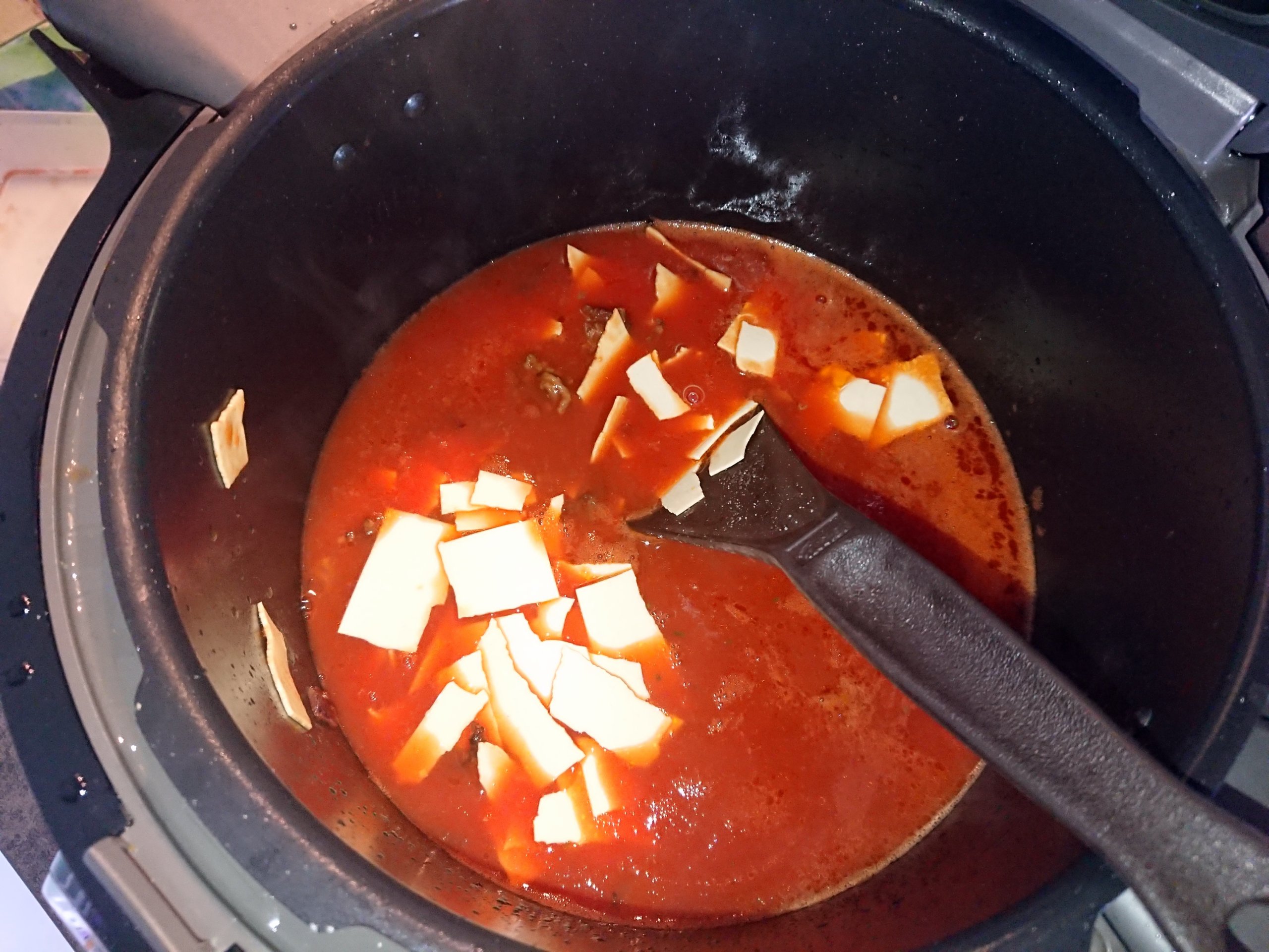 3. Tomaten, Gemüsebrühe und Gewürze dazugeben und kräftig durchrühren. Abschmecken.