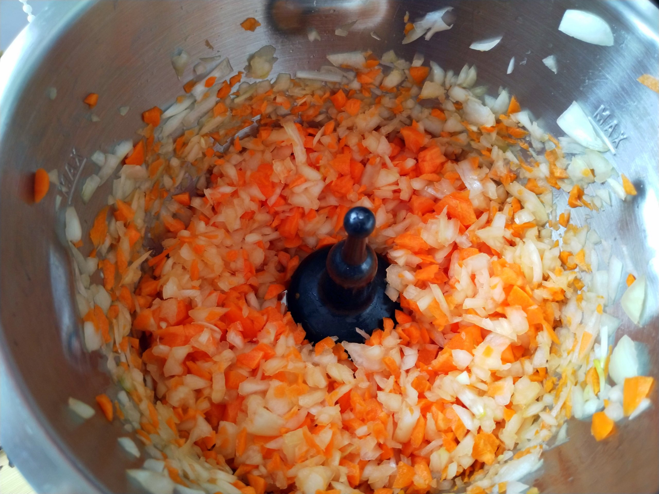 Bei Verwendung der Prep&Cook das Ultrablade-Messer einsetzen. Zwiebeln und Karotten grob zerteilen und 15s auf Stufe 10 zerkleinern. Kartoffeln in kleine Würfel schneiden.