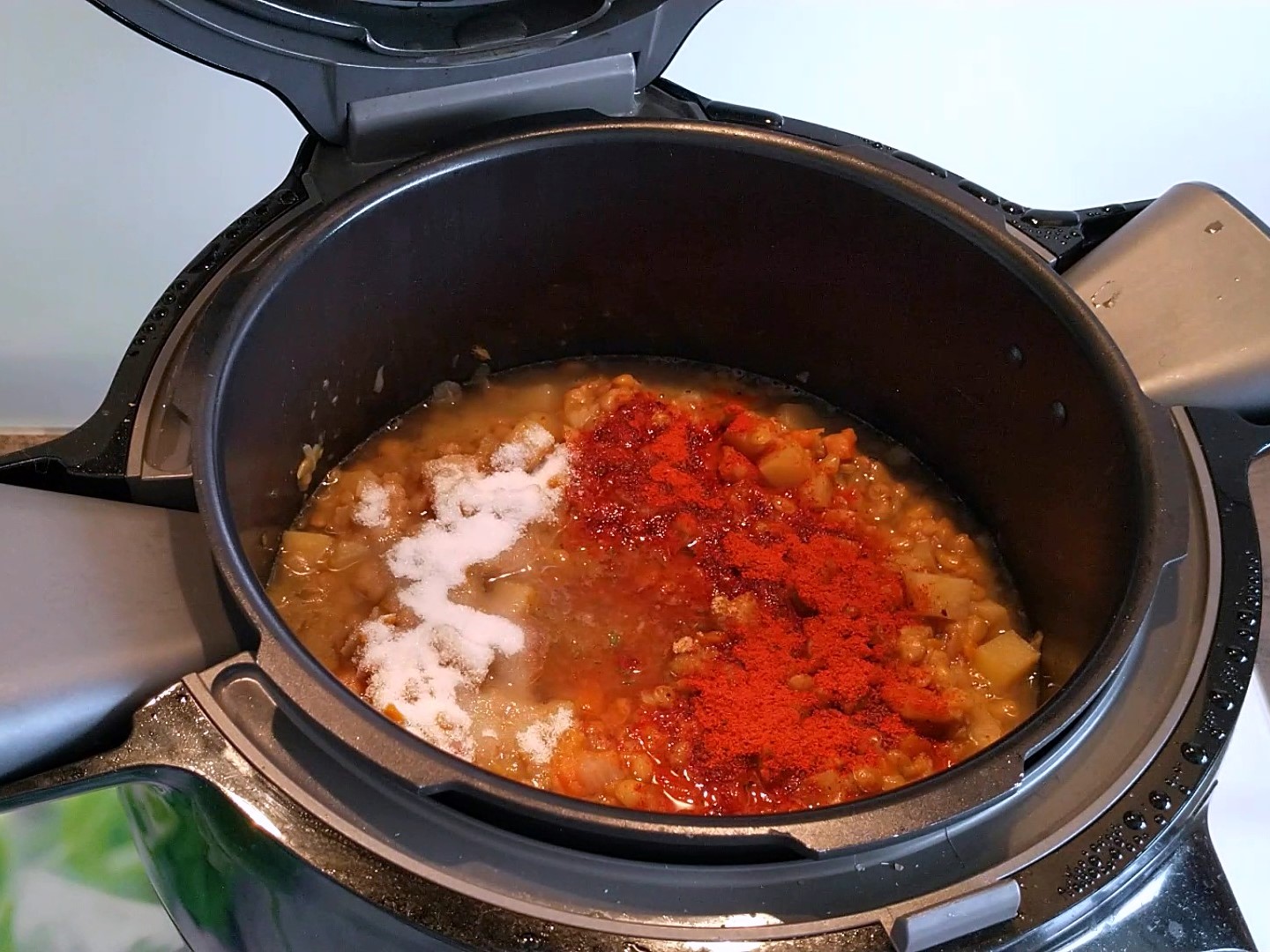 1. Bei der Prep&Cook den Schlag-/Rühraufsatz einsetzen. Speck bei 120°C und Stufe 1 anbraten. Das Gemüse und die Kartoffeln dazugeben und auf Stufe 1 ca. 5 min weiterrühren lassen. Die eingeweichten Linsen waschen und in die Schüssel der Prep&Cook zum kleingeschnittenen Gemüse geben. Wasser angießen, kurz auf Stufe 3 durchrühren und auf Stufe 1 bei 105°C ca. 30 min köcheln. Die Linsen sollten bissfest sein.