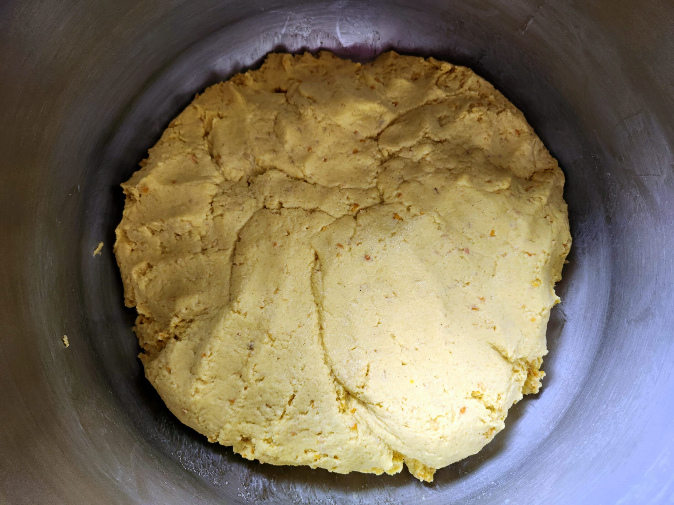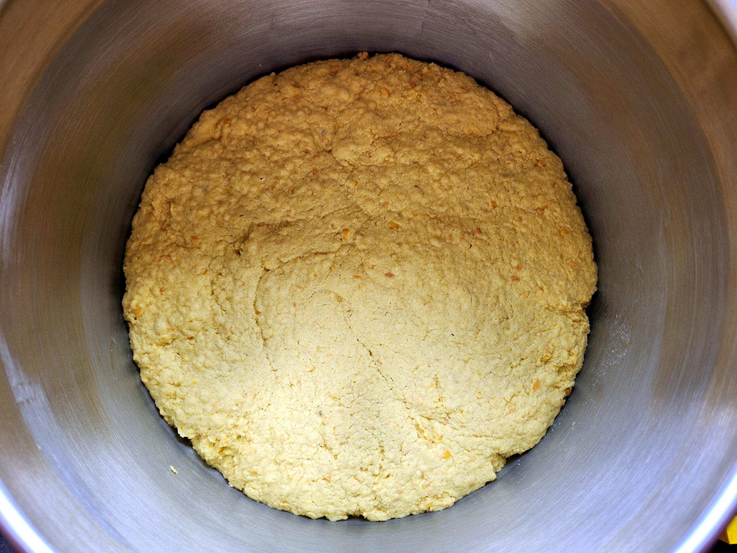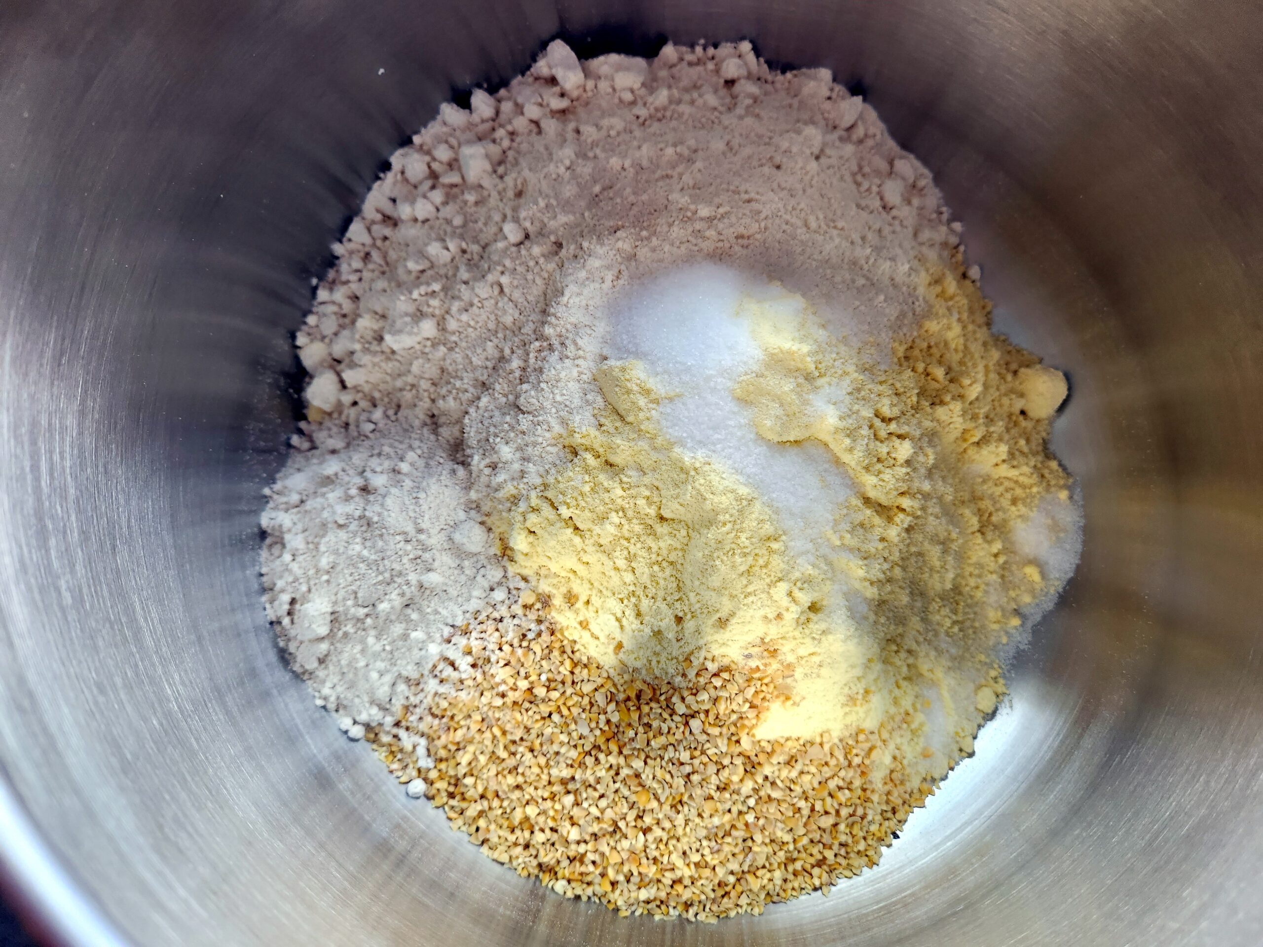 Normalerweise wird Gebäck aus Maismehl sehr feucht und klebrig, deshalb habe ich noch etwas Sojaschrot zugegeben. Herausgekommen ist ein leuchtend gelbes Maisbrot, das geschmacklich super zu Marmelade passt, da Mais ja etwas süßlich ist.