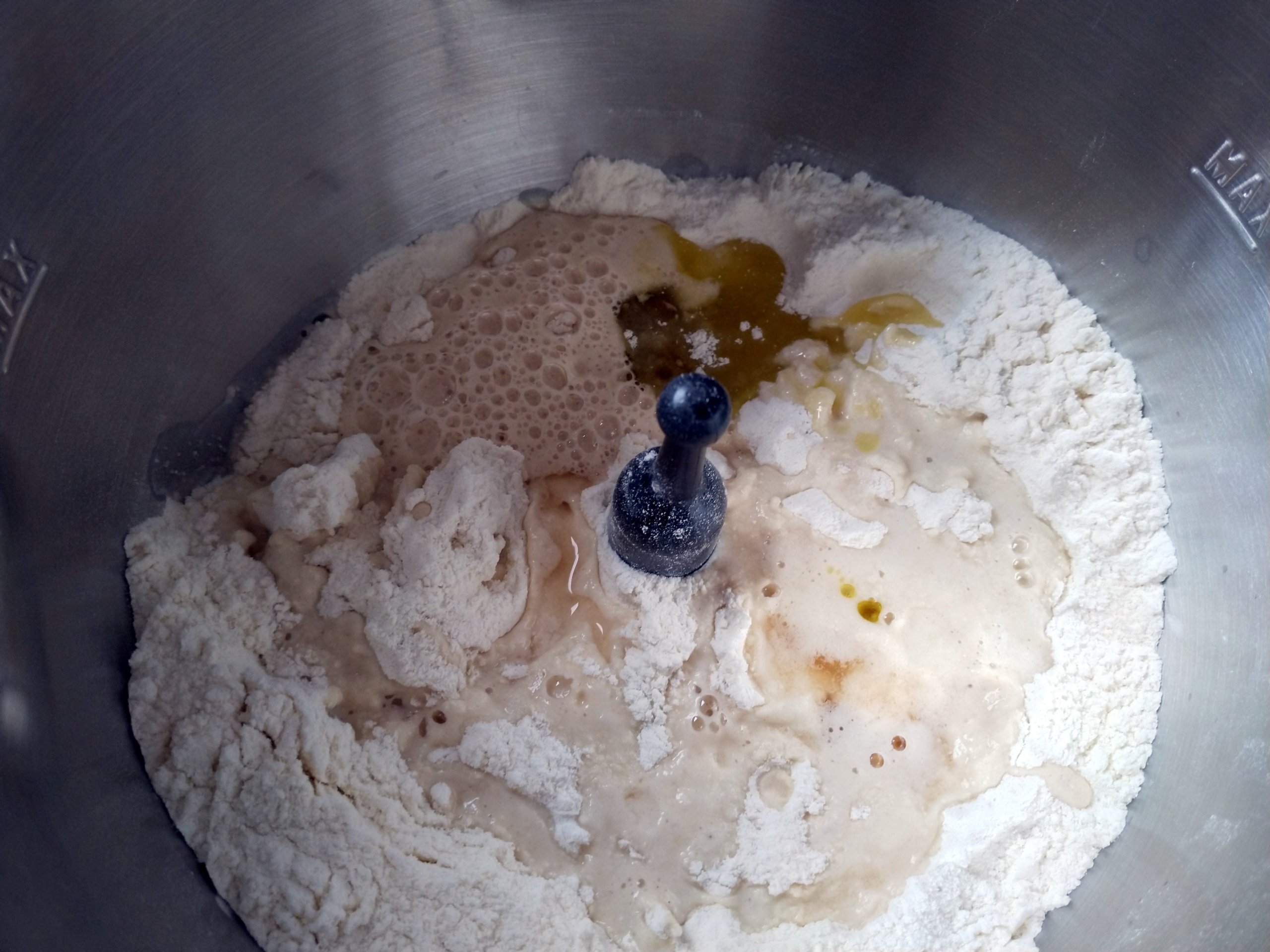 Trockene Zutaten miteinander mischen und eine Kuhle machen. Hefe im lauwarmen Wasser auflösen und in die Kuhle gießen. Mit äußerem Mehl bestäuben und 10 min stehen lassen.