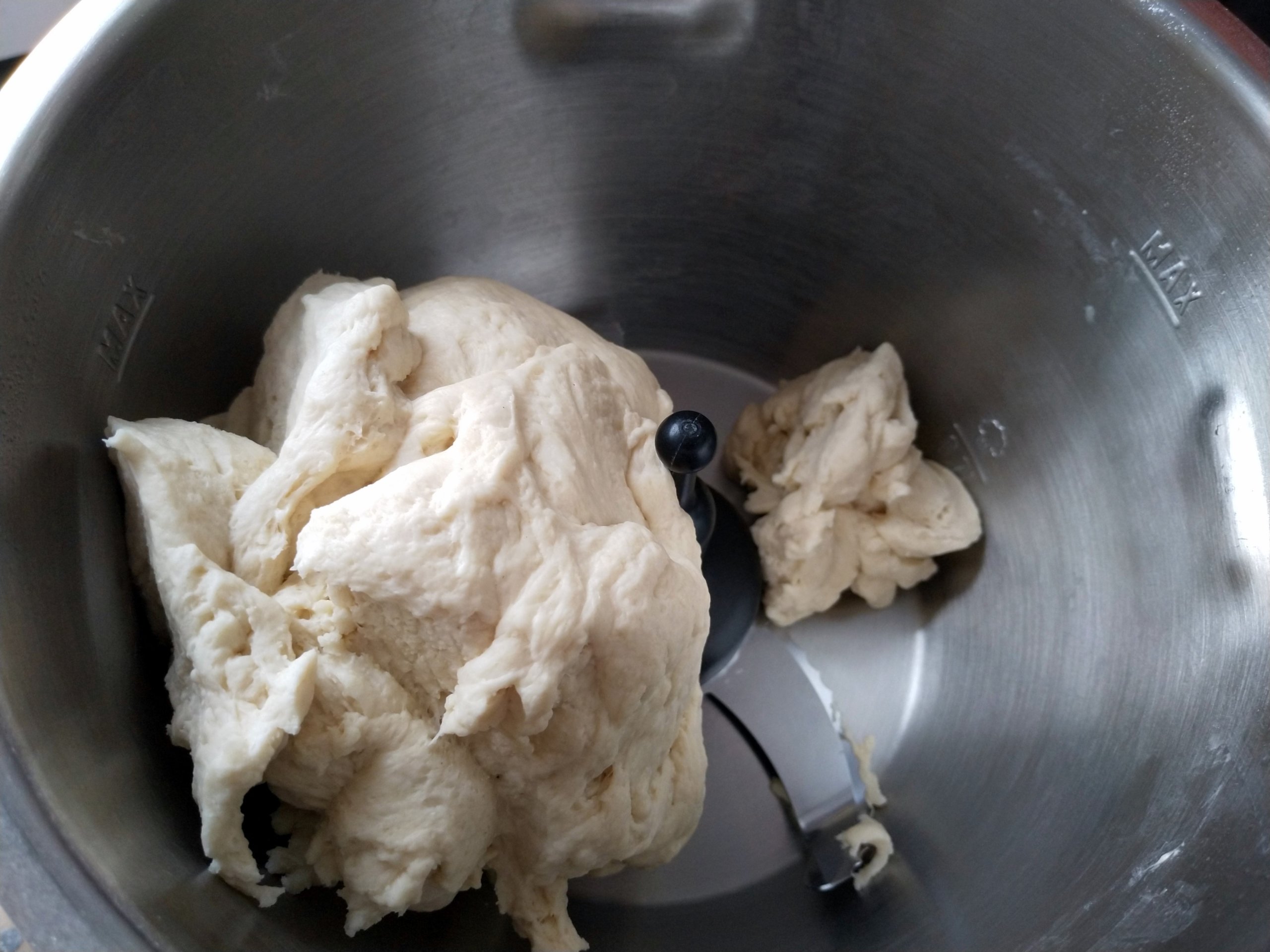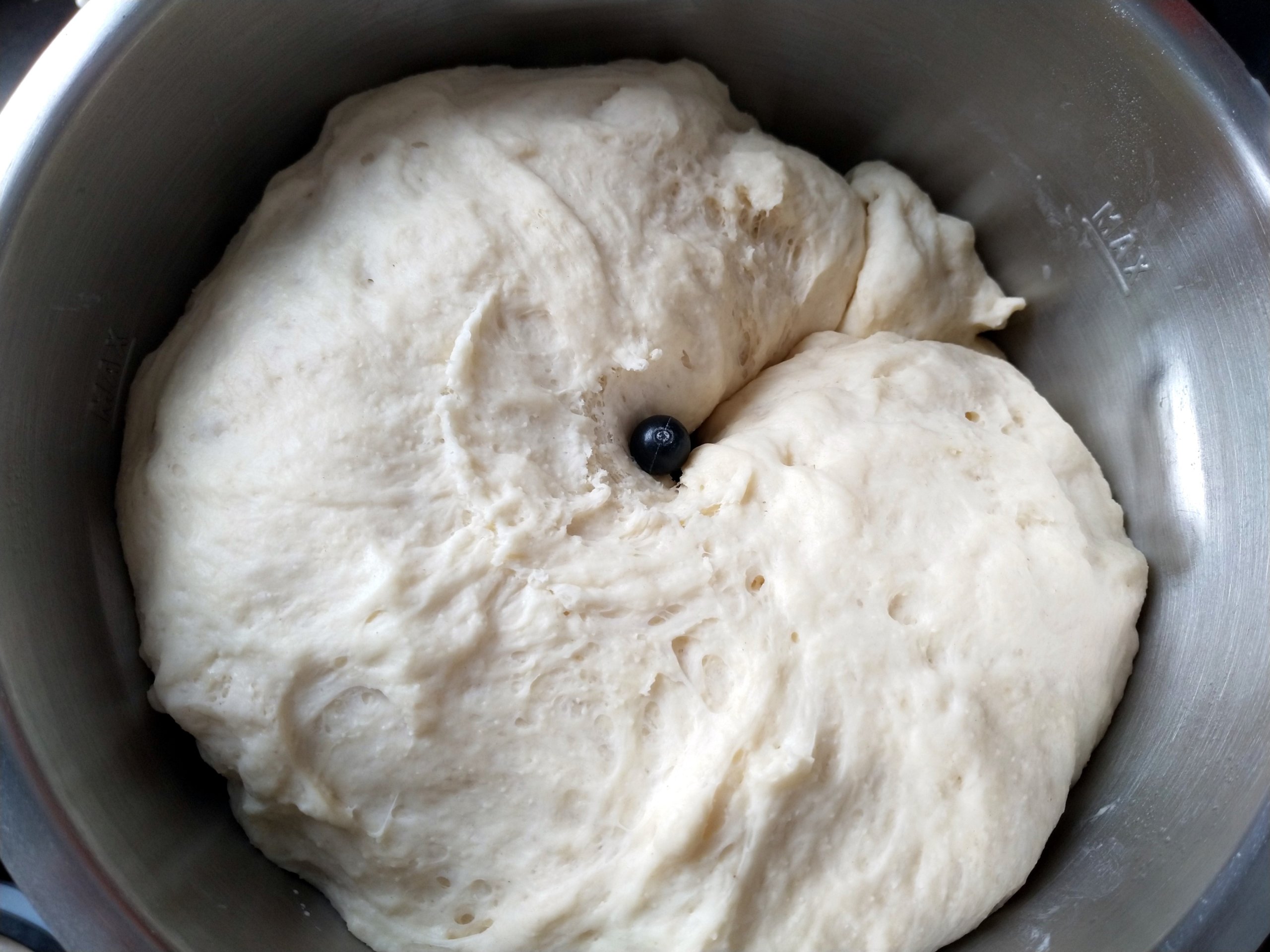 Teig durchkneten, dass die Luft entweicht und nochmals 1 h gehen lassen. Dieses noch einmal wiederholen, so dass der Teig insgesamt nochmal 2 h geht.