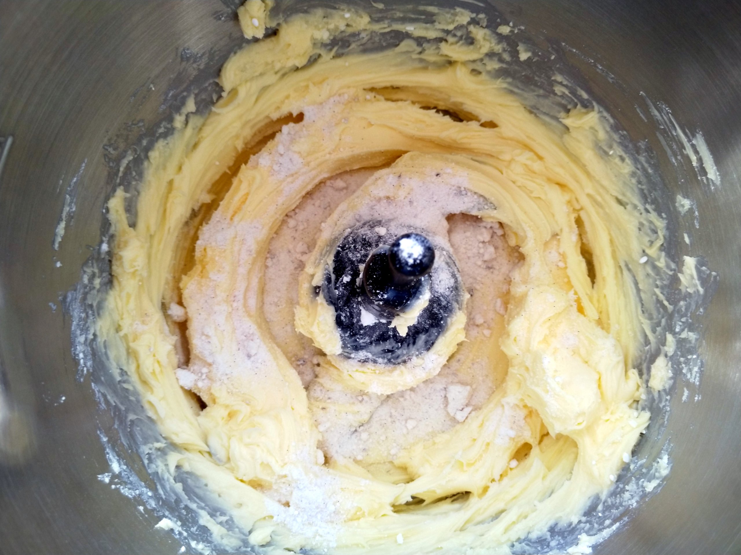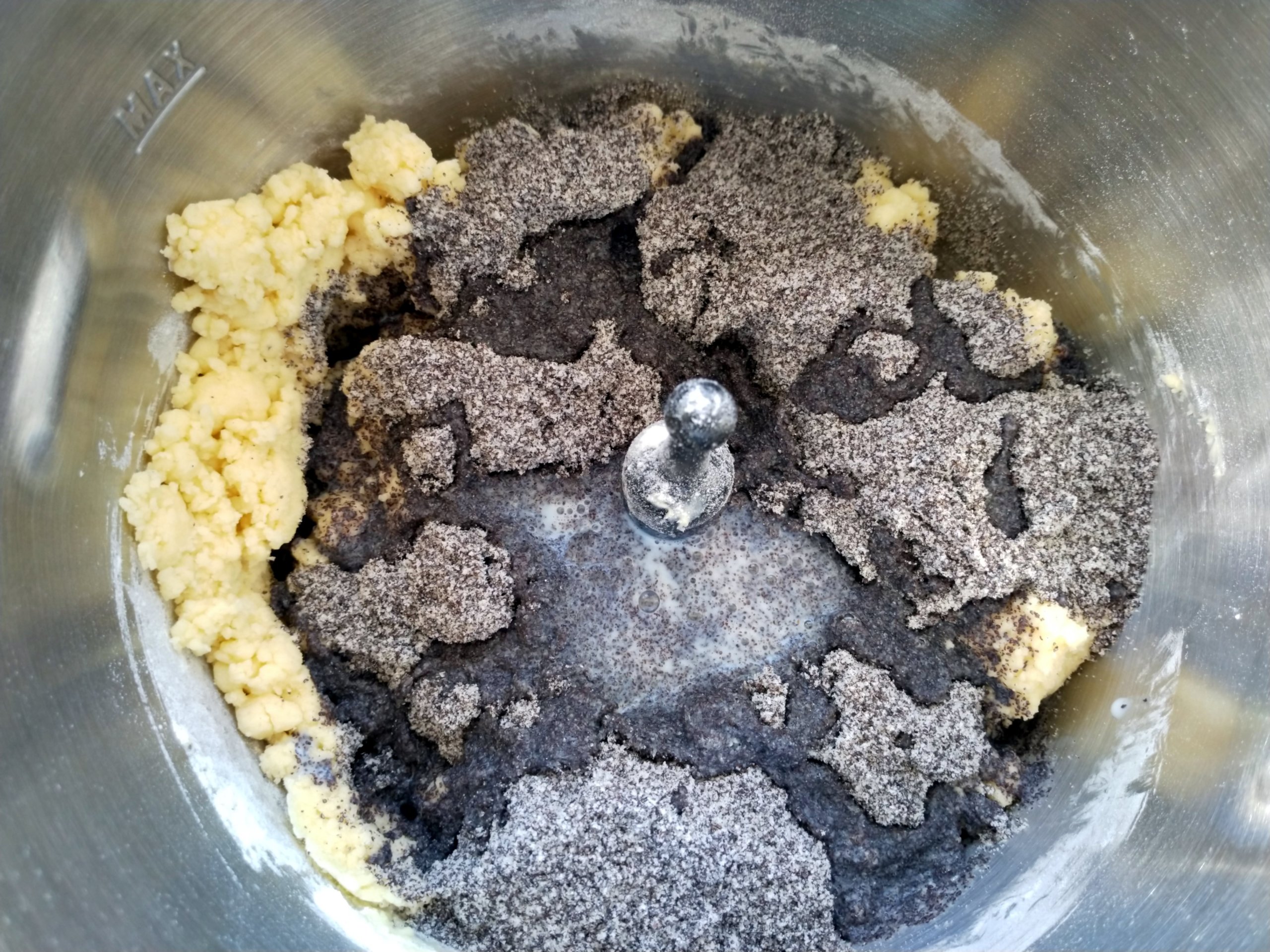 Mehl und Mohn abwechselnd mit dem Wasser unter die Buttermasse rühren.