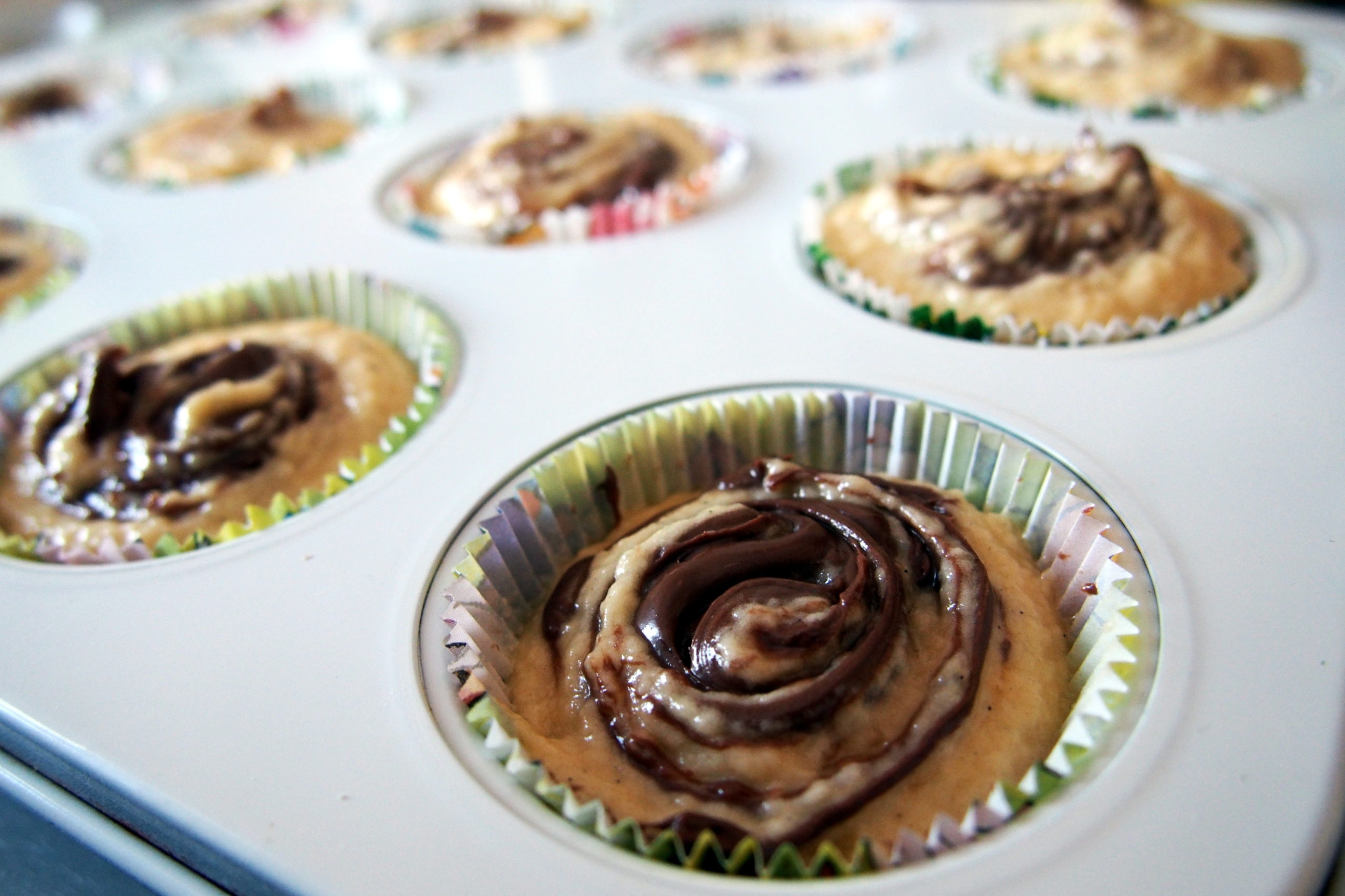 Den Teig in die Muffinform füllen und in die Mitte jeweils einen Teelöffel Nutella setzen. Das Nutella sollte etwas warm sein, damit es sich besser vermischen lässt. Anschließend mit einem Holzstäbchen das Nutella verquirlen. Bei 200°C 5 min backen, dann die Hitze auf 160°C reduzieren und 15 min fertigbacken.