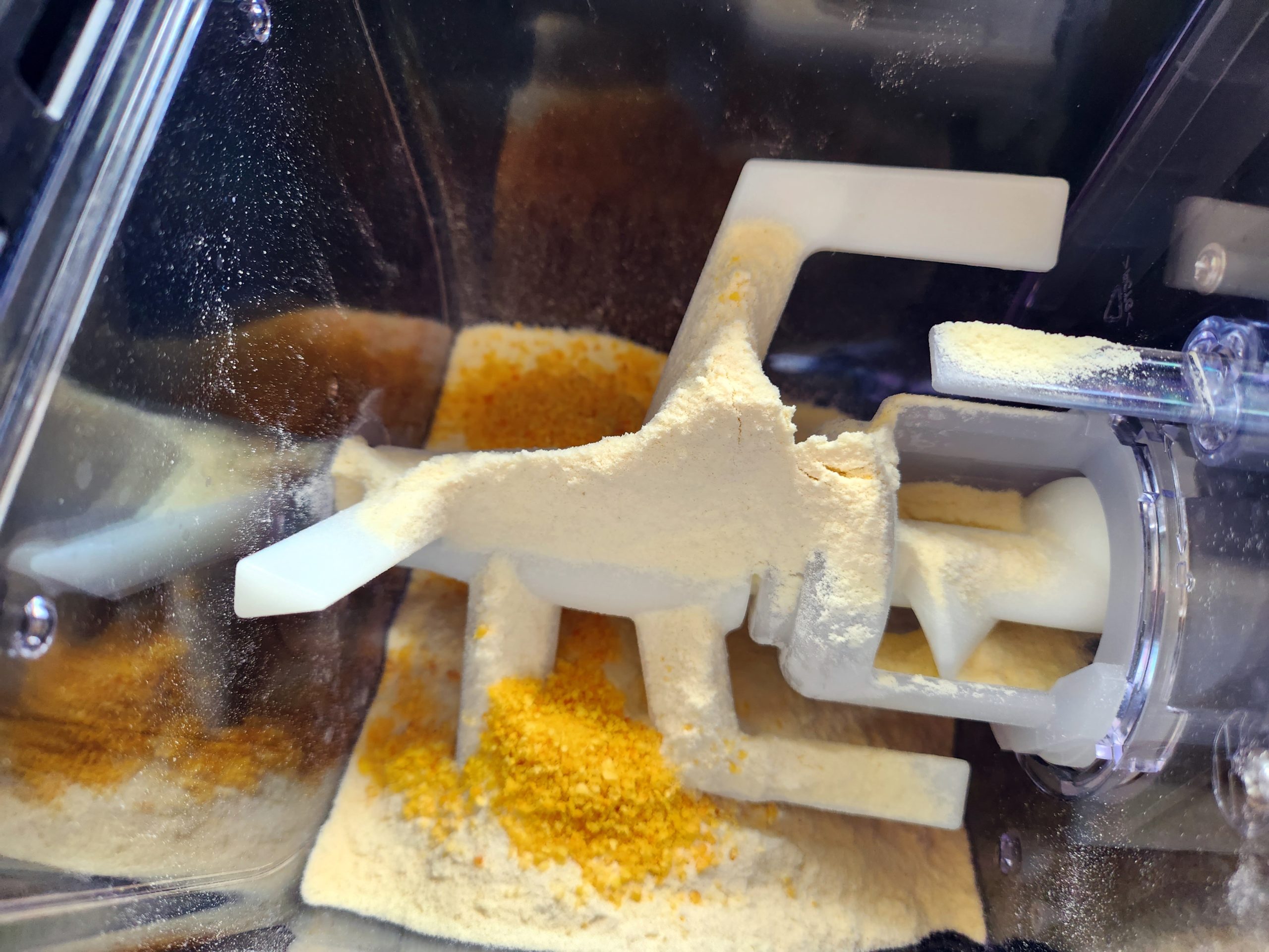 1. Semola und Orangenschale in die Pastamaschine geben. Das Ei in das Flüssigkeitsgefäß geben und mit Orangensaft bis zur Markierung auffüllen, gut vermengen. Programm starten und die Ei-Saft-Mischung durch die Deckelöffnung gießen.