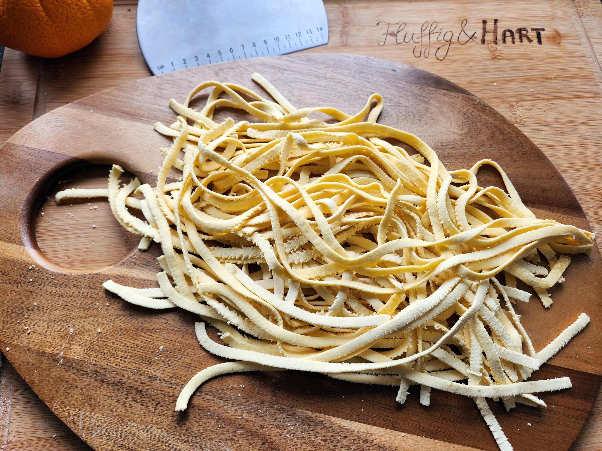 Wenn man selber schneidet den Teig mit ordentlich Semola dünn ausrollen (entweder mit einer Nudelmaschine oder mit dem Nudelholz). Den Teig mehrmals übereinander schlagen, als würde man einen Stoff zusammenlegen, dabei mit Semola gut bestreuen. In 2-3 cm breite Streifen schneiden.