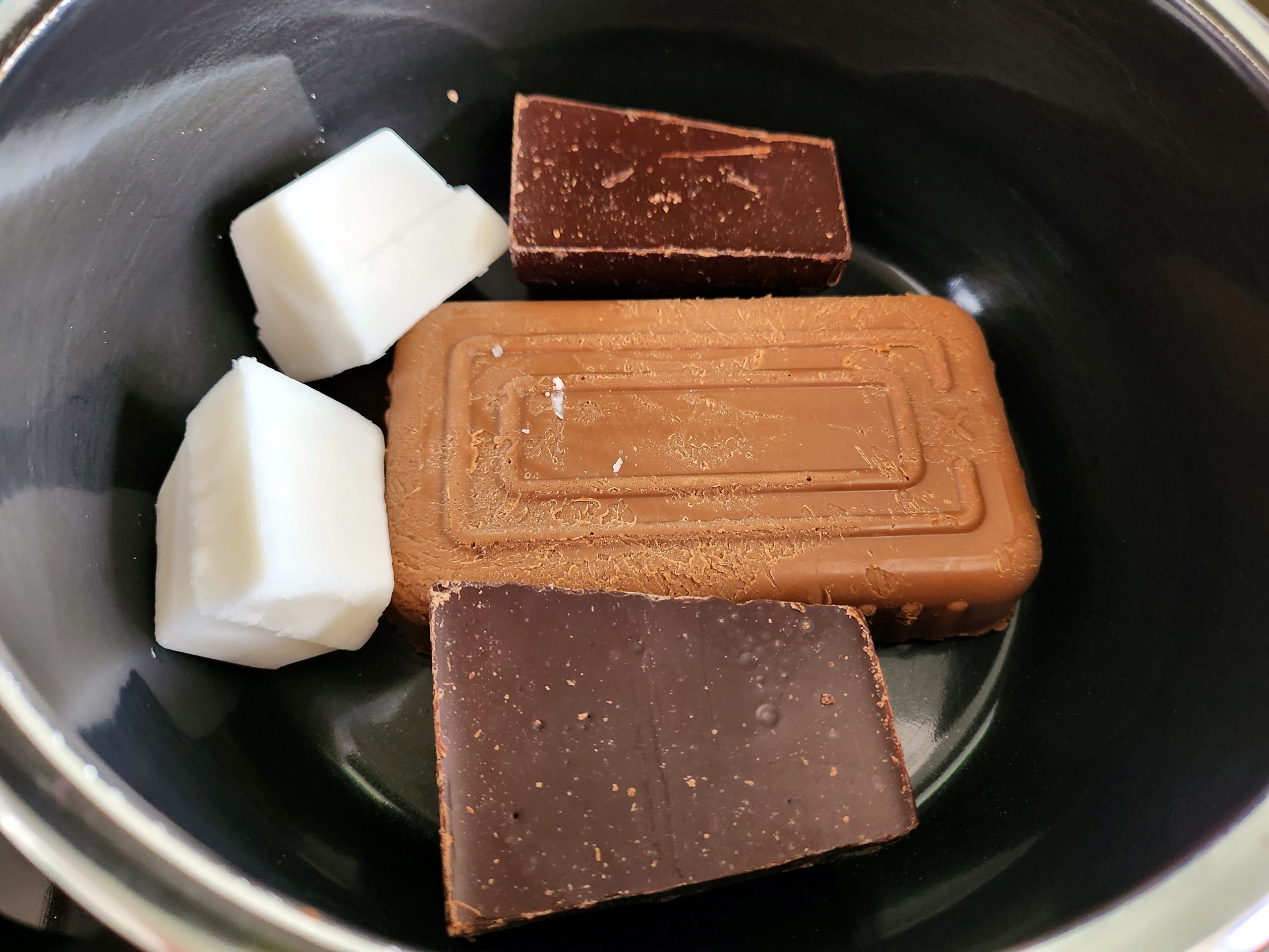 1. Nougat, Schokolade und Kokosöl in einen kleinen Topf geben und auf mittlerer Hitze schmelzen. Zum Schluss die gehackten Haselnüsse und den restlichen Orangensaft unterrühren.