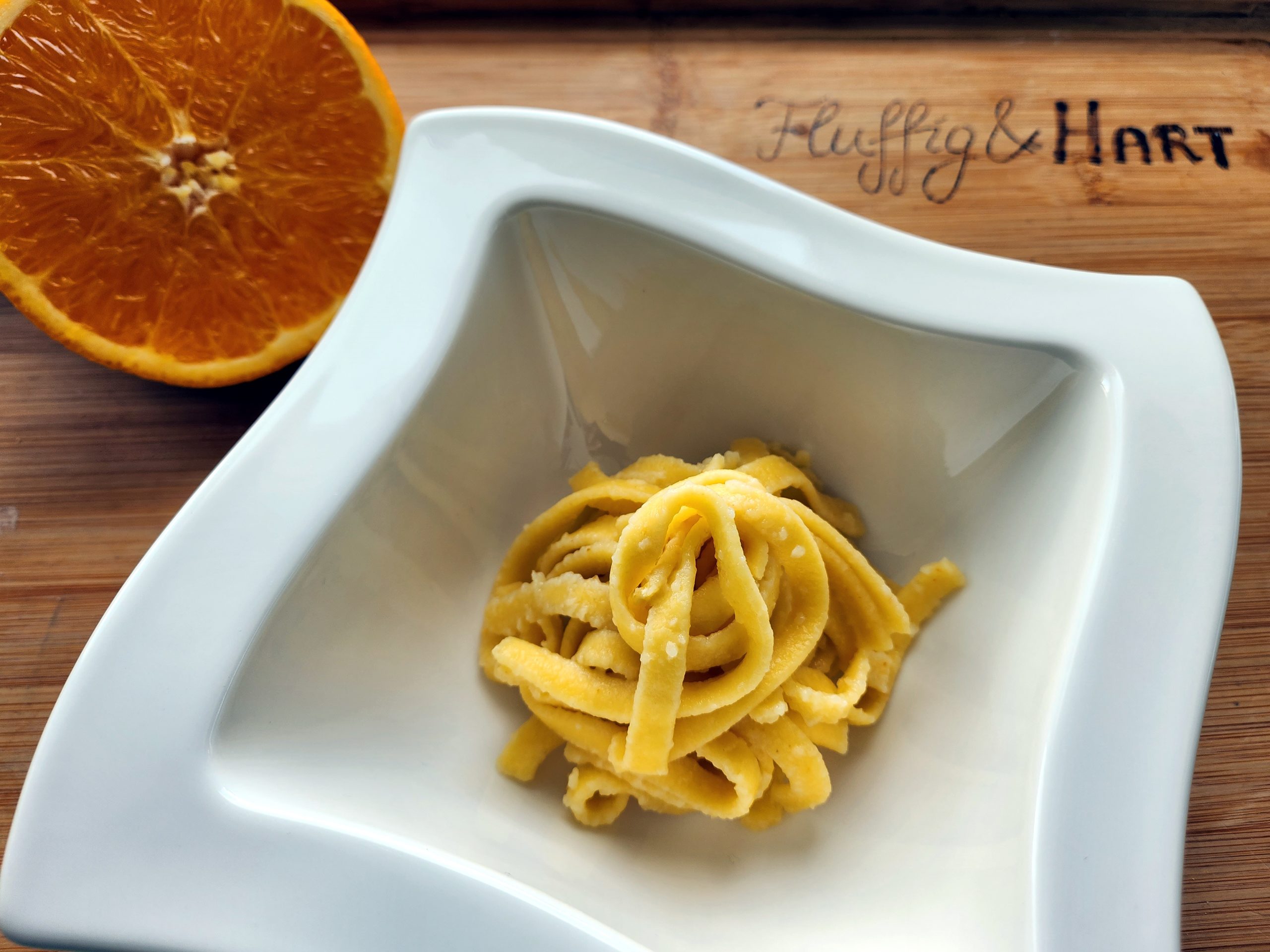 Nun klingen Orangennudeln mit Schokoladensauce nicht wirklich typisch thüringisch, oder? Petra hat in ihrem Blog eine kulinarische Wunderwelt geschaffen. Hängen geblieben bin ich bei ihrer leckeren Schokoladenpasta. Was bei ihr als Schokoladentortellini mit Nusskrokant, karamellisierter Ananas und Portwein angefangen hat, wurde bei mir zu Orangennudeln mit Schokoladensauce, quasi umgedreht. Statt die Schokolade in den Nudelteig einzuarbeiten, kommen bei mir Orangenschale und -saft zum Einsatz. Die Schokolade wird stattdessen mit Nougat und gerösteten, gehackten Haselnüssen als Sauce zu den Nudeln gereicht. So wird aus Petras weihnachtlichem Dessert ein ausgefallenes Nudelgericht, dass nicht nur als Nachtisch, sondern auch als süßes Mittagessen alternativ zu Kaiserschmarrn oder Dampfnudeln zubereitet werden kann.