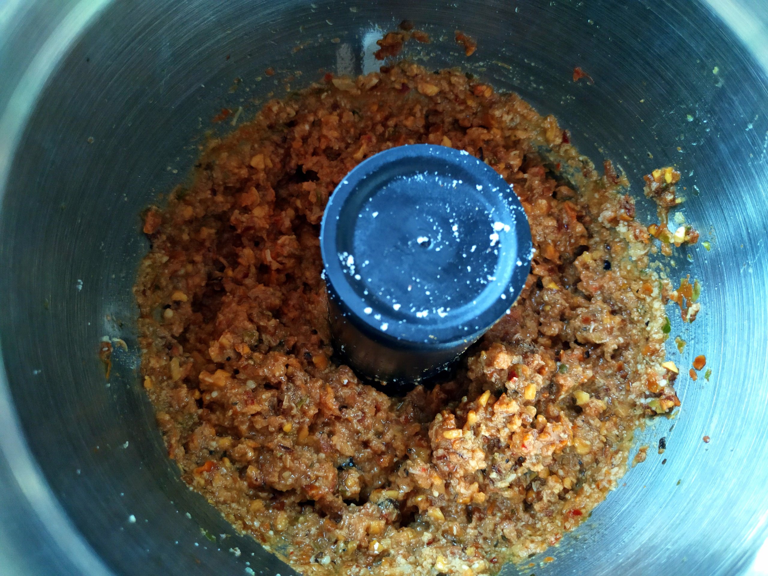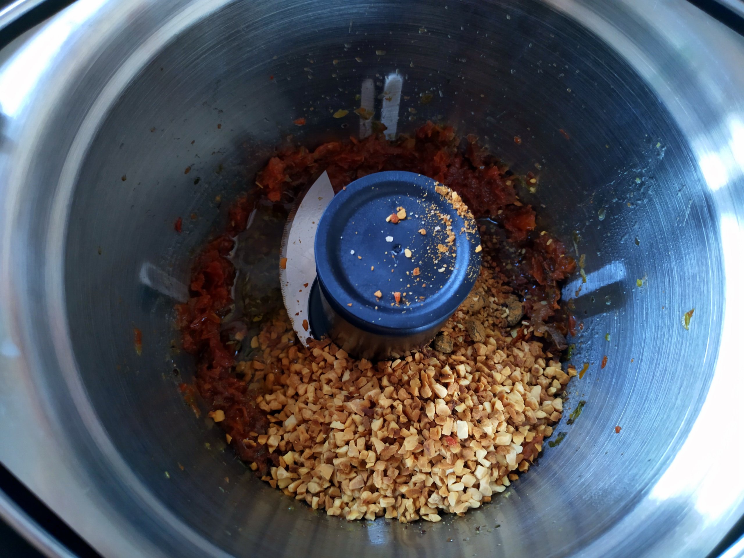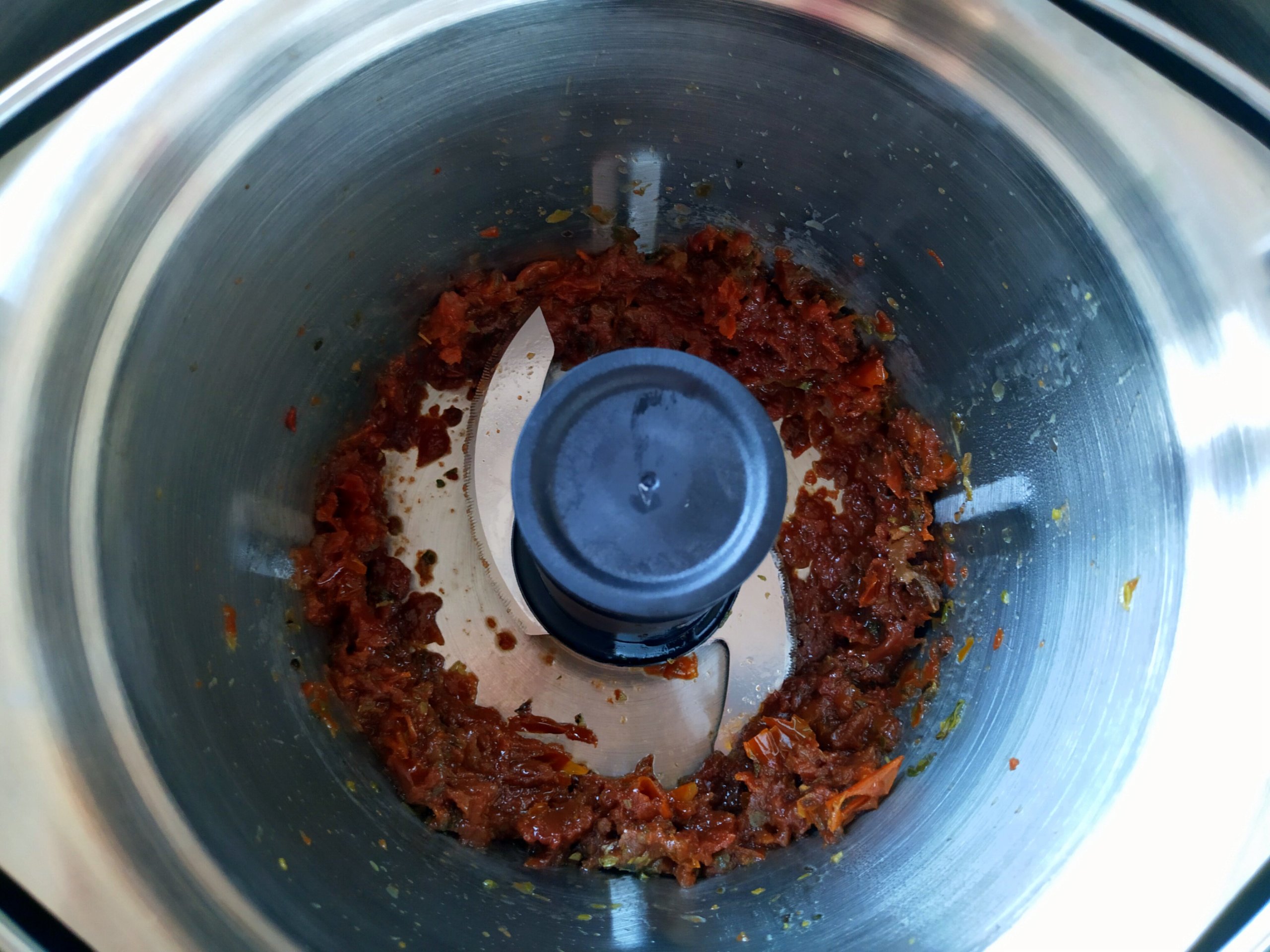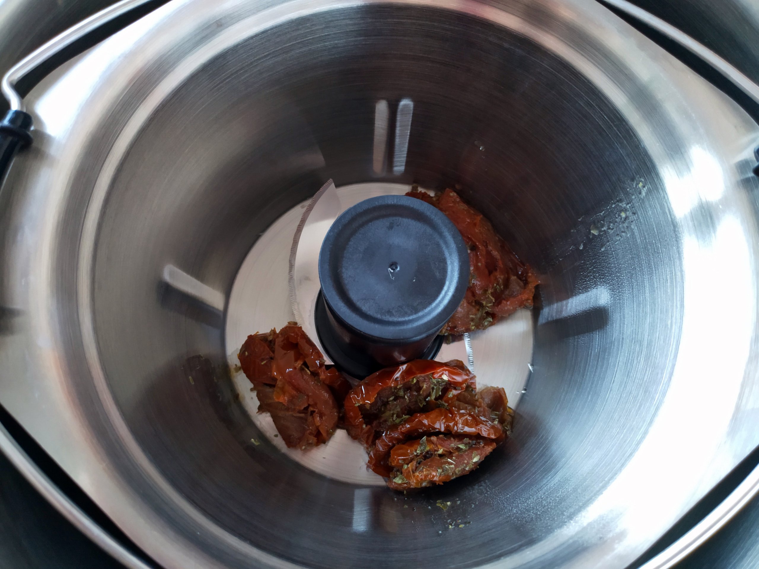 Getrocknete Tomaten abtropfen lassen und in einem Topf mit 100 ml Wasser bedecken. Oregano dazu und aufkochen. 5min köcheln lassen und anschließend ohne Wasser in die Minischüssel geben (Wasser aufheben). Auf Stufe 10 für 10s zerkleinern.