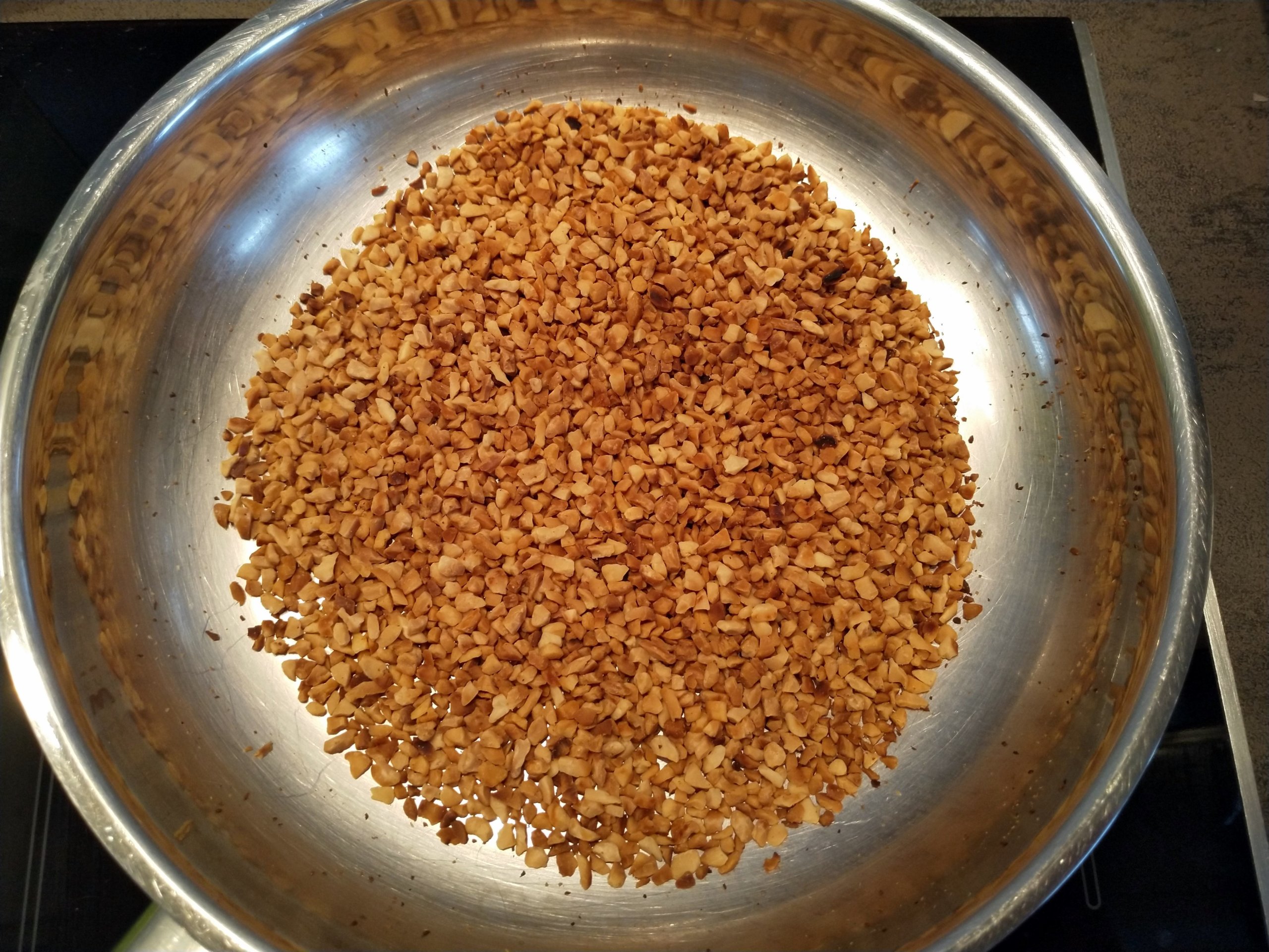 Gehackte Mandeln in einer Pfanne ohne Fett anrösten und abkühlen lassen.