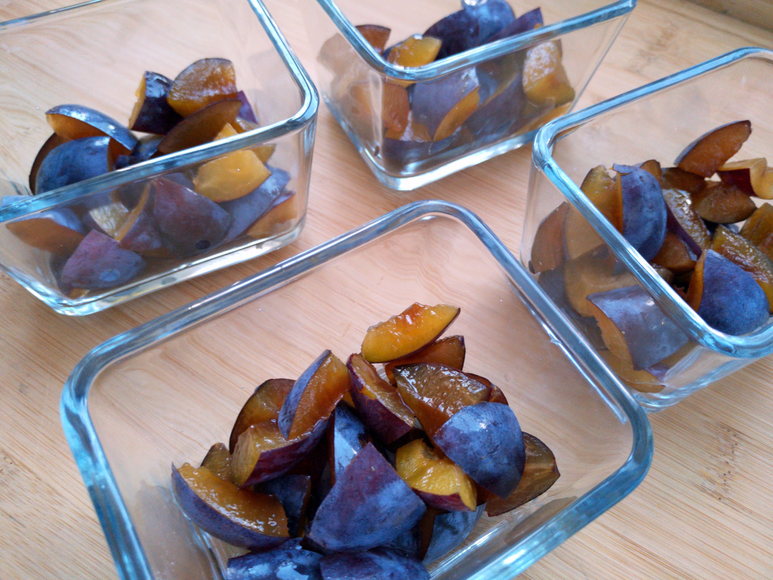 Die Pflaumen entsteinen und je nach Größe vierteln oder noch kleiner in mundgerechte Stücke schneiden. In vier feuerfeste Förmchen geben.