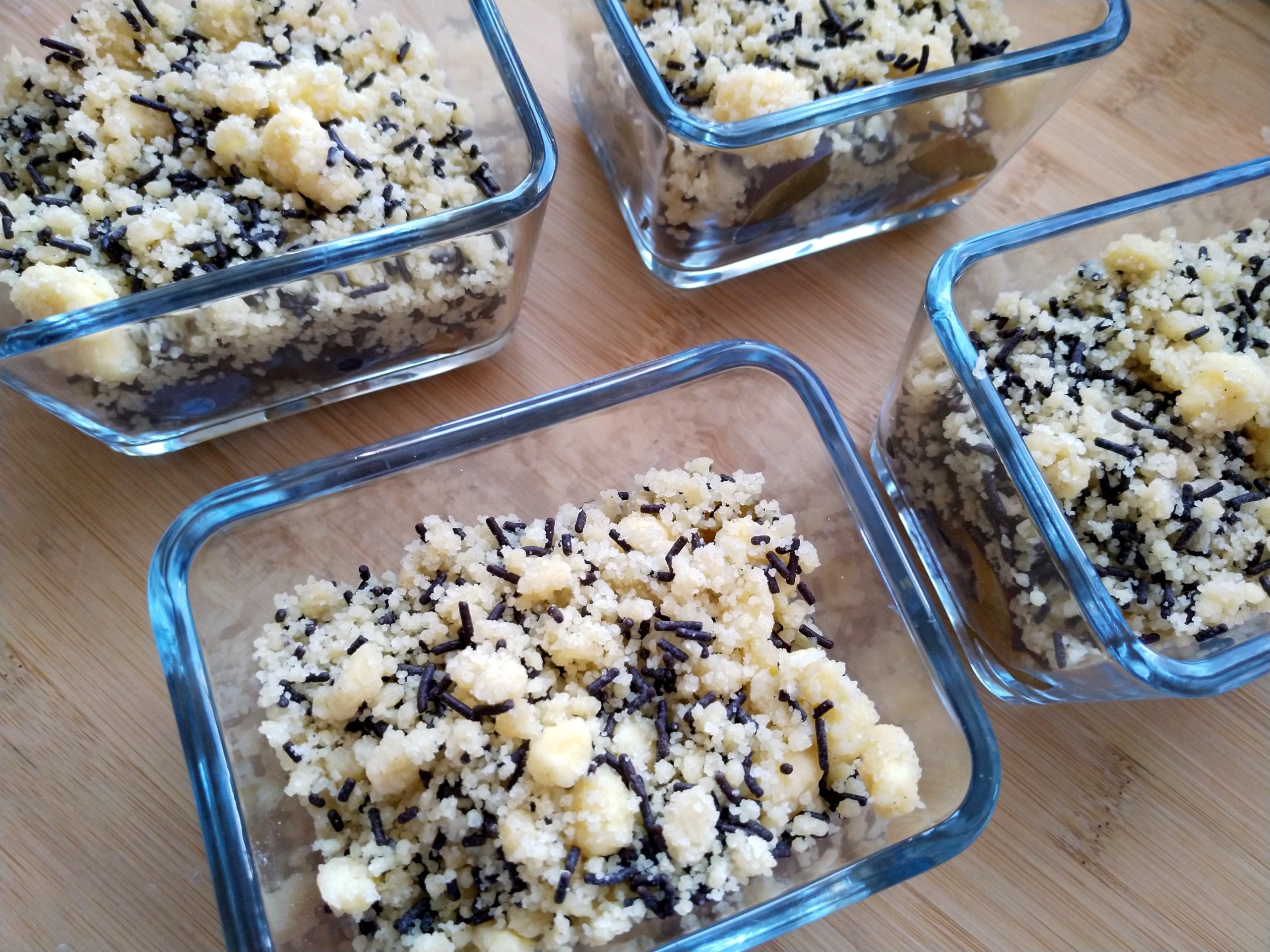 Anders als in einem klassischen Crumble habe ich hier die Streusel noch mit Schokoladenstreuseln gemischt. Das gibt dem Ganzen einen lecker schokoladigen Touch. Diese Variante passt auch gut zu Äpfeln oder Birnen.