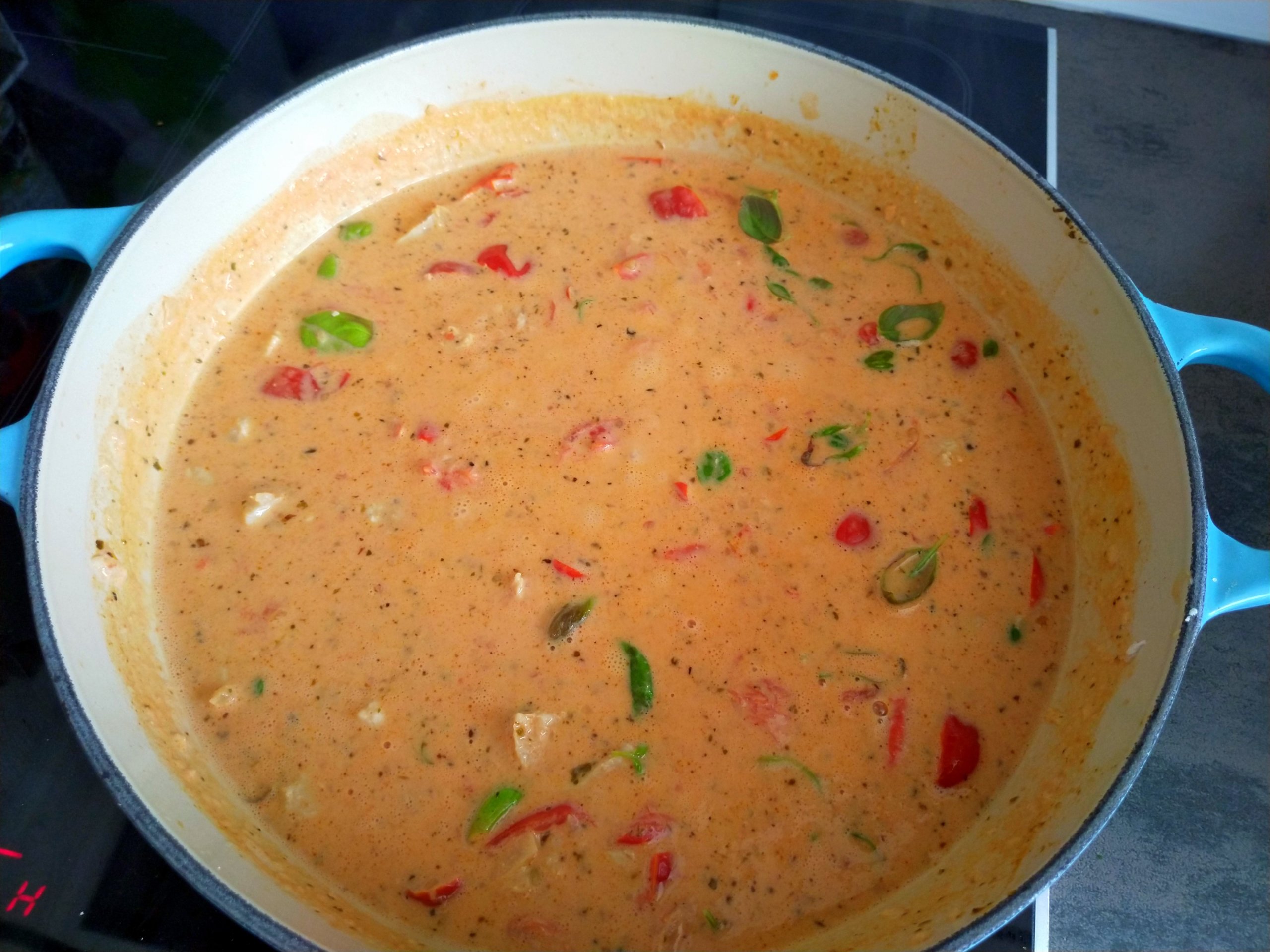 Wer es vegetarisch mag, lässt das Putenfleisch weg und gibt noch etwas mehr Gemüse in die Sauce. Das können Paprikawürfel, Zwiebelspalten aber auch Spinat oder gegrillte Zucchini sein.