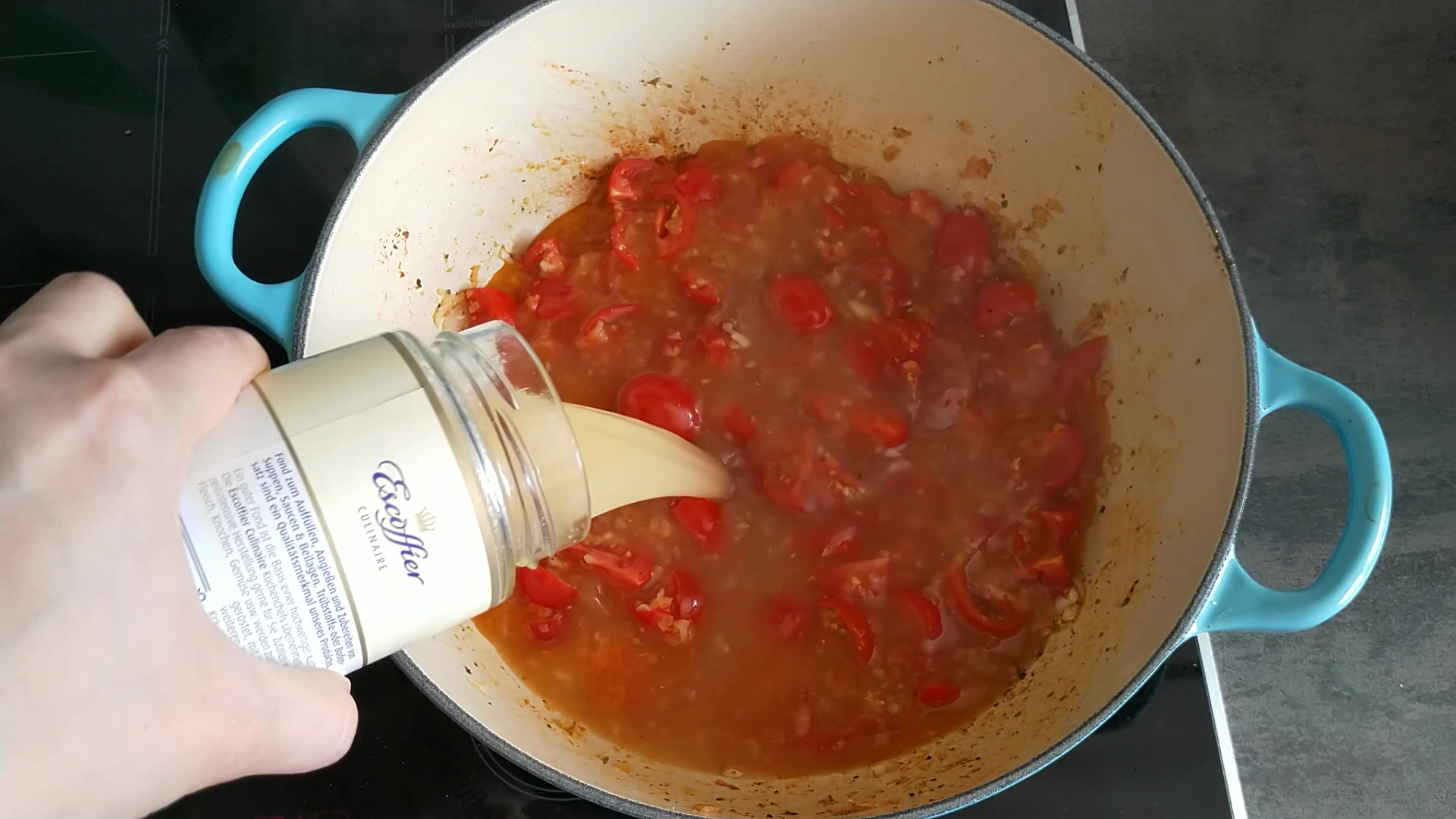4. Mit dem Geflügelfond ablöschen und aufkochen lassen. Anschließend den Frischkäse hinzugeben und unter Rühren lösen.