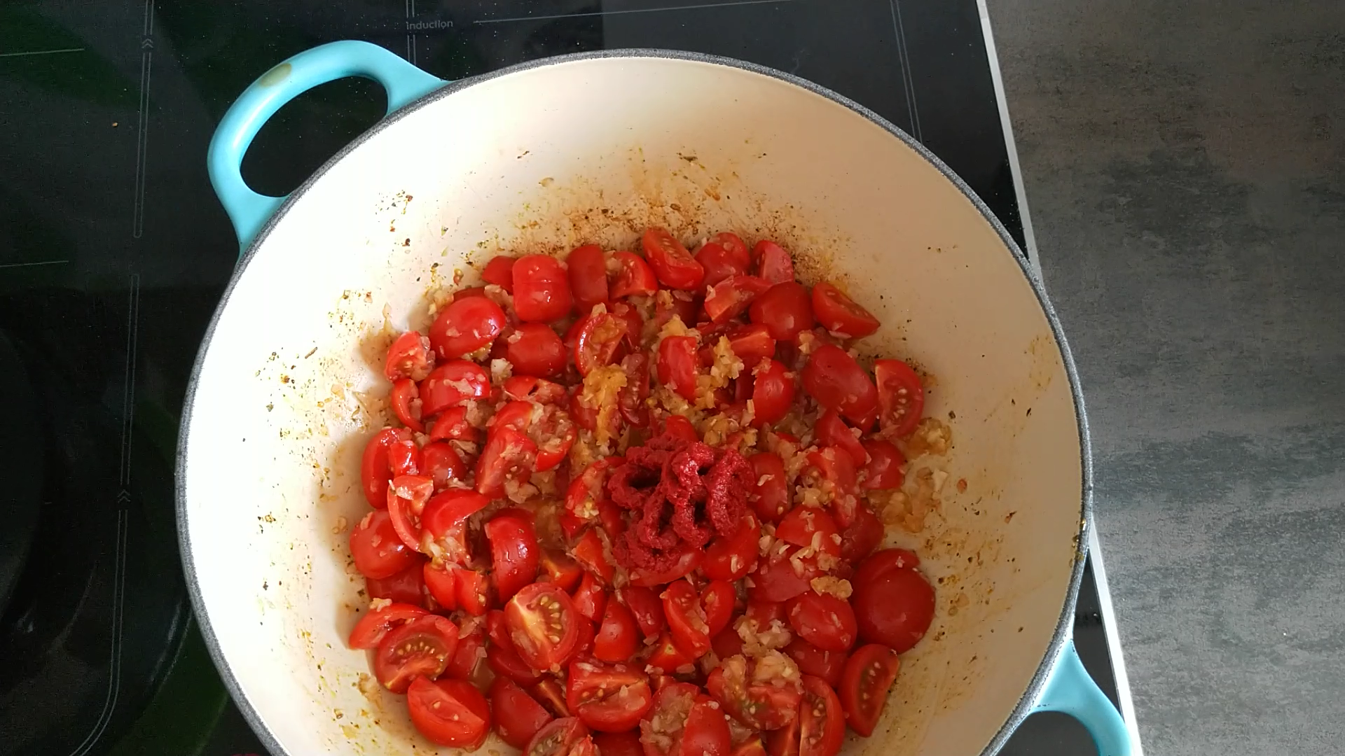 Während das Fleisch brät, die Zwiebel klein schneiden, Knoblauchzehen fein hacken und die Cocktailtomaten vierteln.