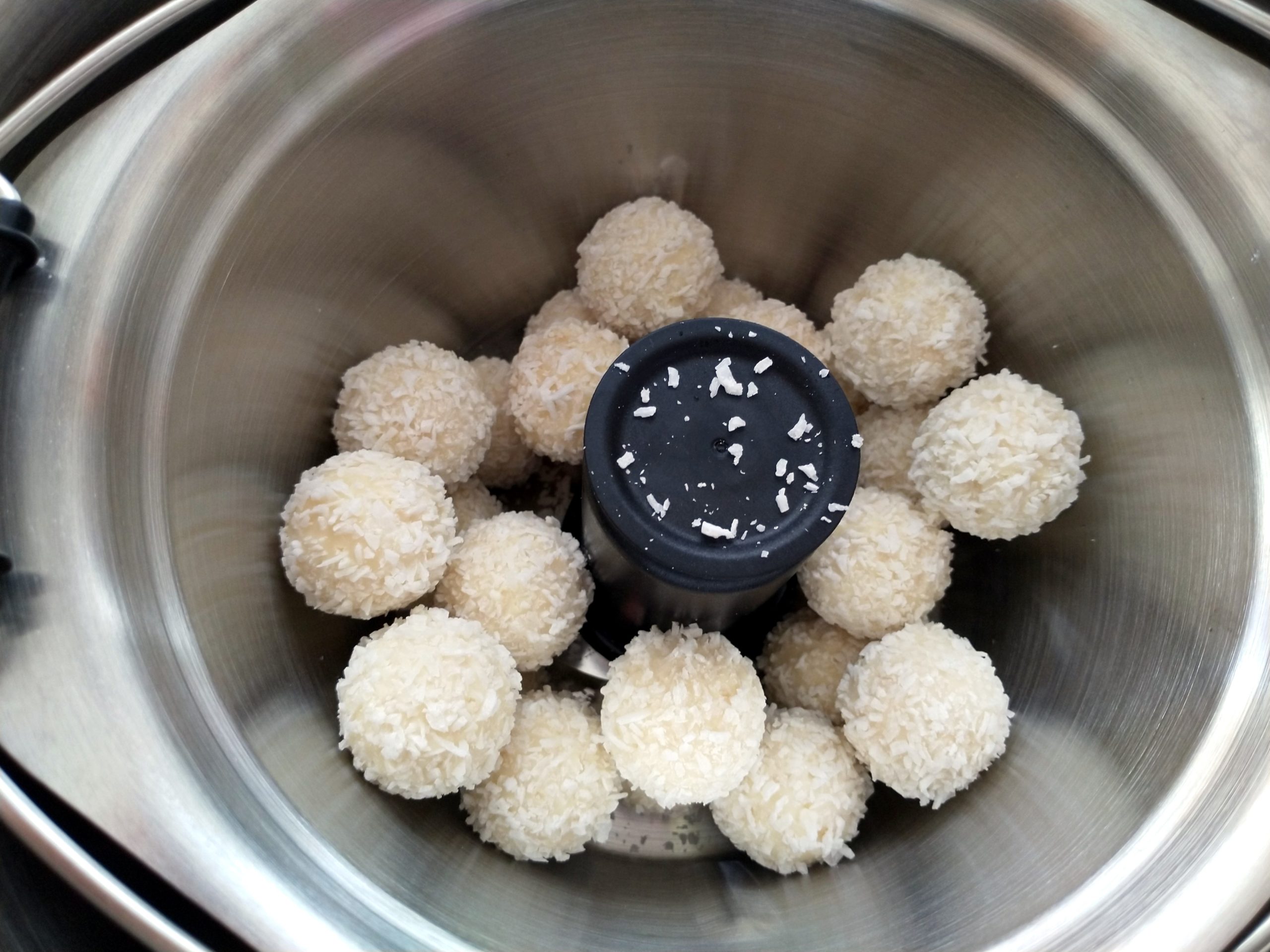Bei Verwendung der Prep&Cook den Schlag-/Rühraufsatz einsetzen. Milch, Zucker und Raffaello-Masse in die Schüssel geben. Etwas Milch (ca. 50 ml) zurückhalten um die Speisestärke anzurühren. Auf Stufe 3 bei 110° rühren, bis die Milch anfängt zu kochen. Die Speisestärke-Mischung durch die Deckelöffnung zugeben und weiterrühren lassen. Temperatur auf 0°C stellen und auf Stufe 5 weiterrühren, bis ein Pudding entsteht.