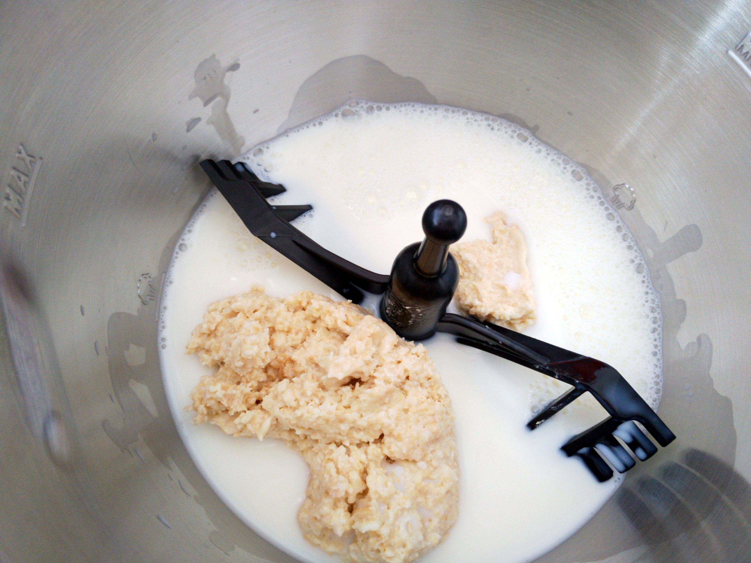 Milch und Zucker in einem Topf mit der Raffaello-Masse erhitzen. Etwas Milch (ca. 50 ml) zurückhalten um die Speisestärke anzurühren. Wenn die Milch kocht vom Herd nehmen, die Speisestärke einrühren und 1 min weiterrühren.
