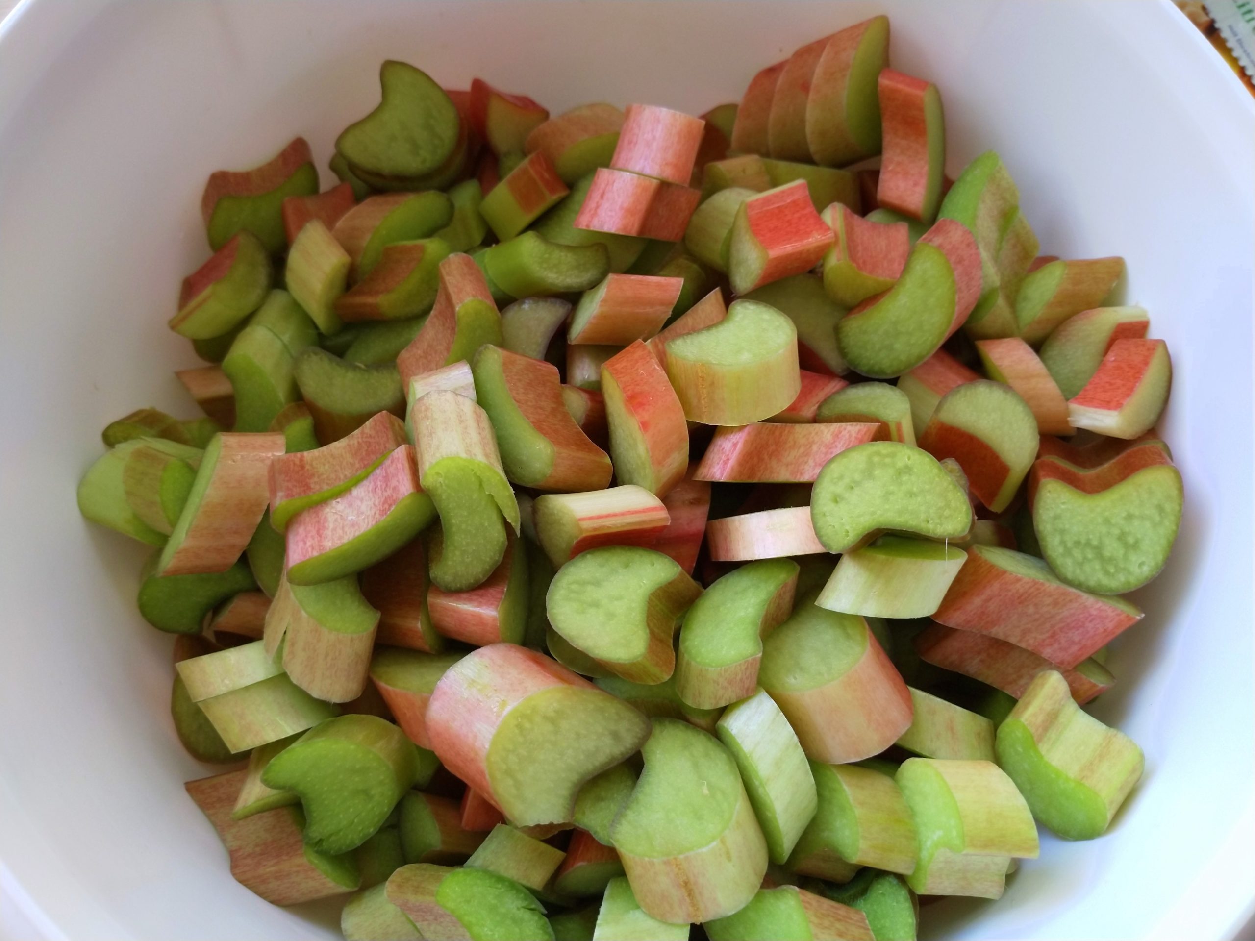 Rhabarber waschen, putzen und die Haut abziehen. Anschließend in ca. 1 cm lange Stücke schneiden.