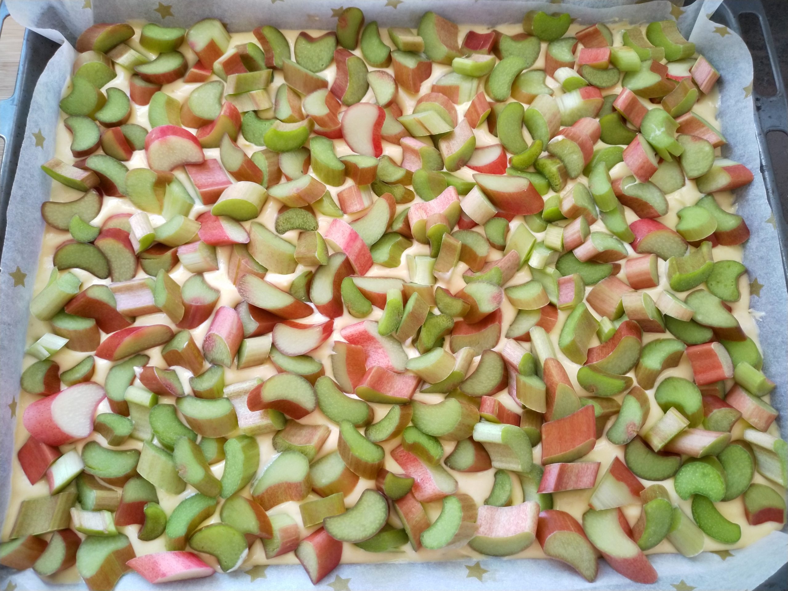 Mehl mit Backpulver mischen und mit der Milch abwechselnd einrühren. Teig auf ein Backblech streichen, gleichmäßig mit Rhabarber belegen und mit den Streuseln bestreuen.