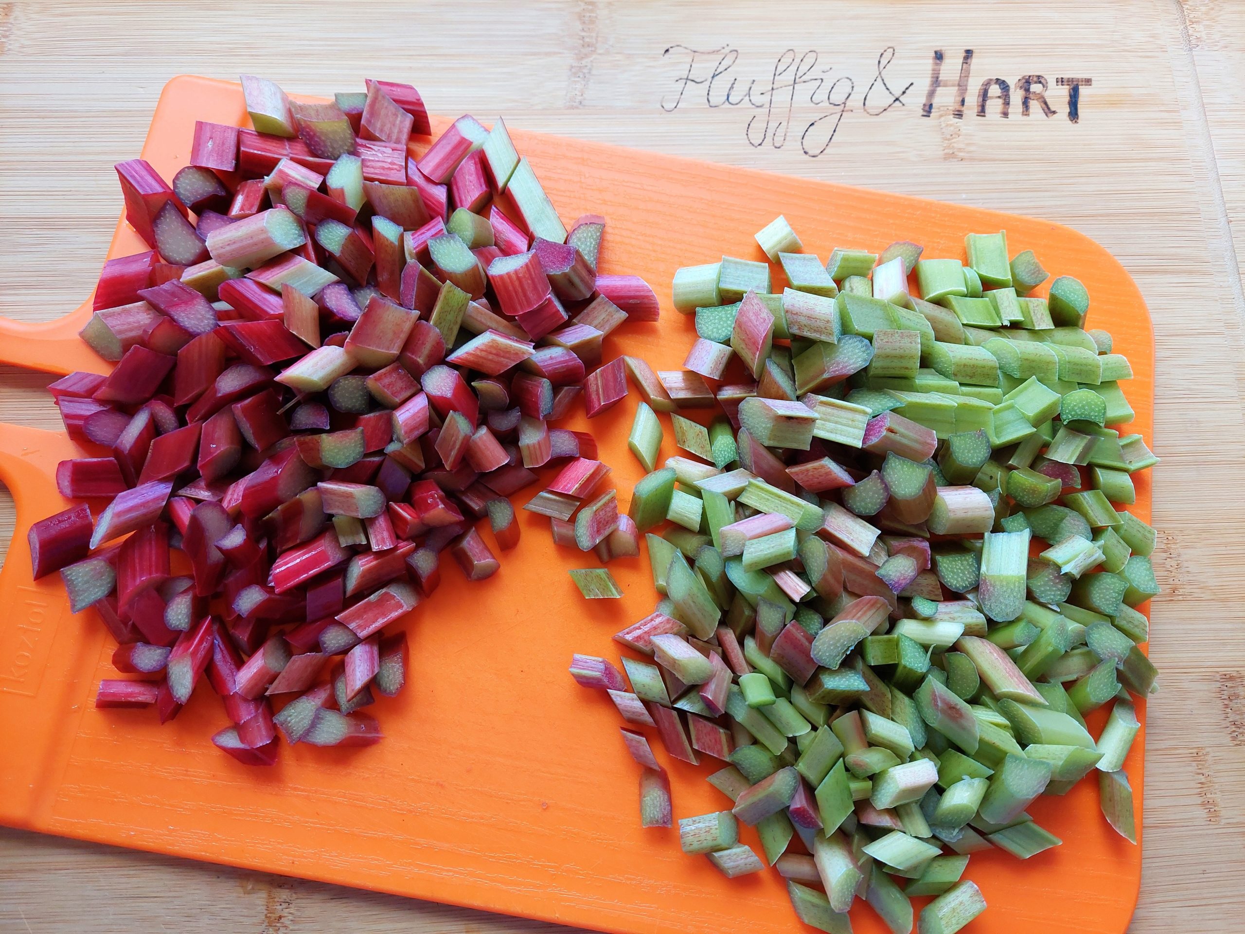 Rhabarber putzen und schräg in kleine Stückchen schneiden. Dabei die grünen Teile von den rötlichen trennen.