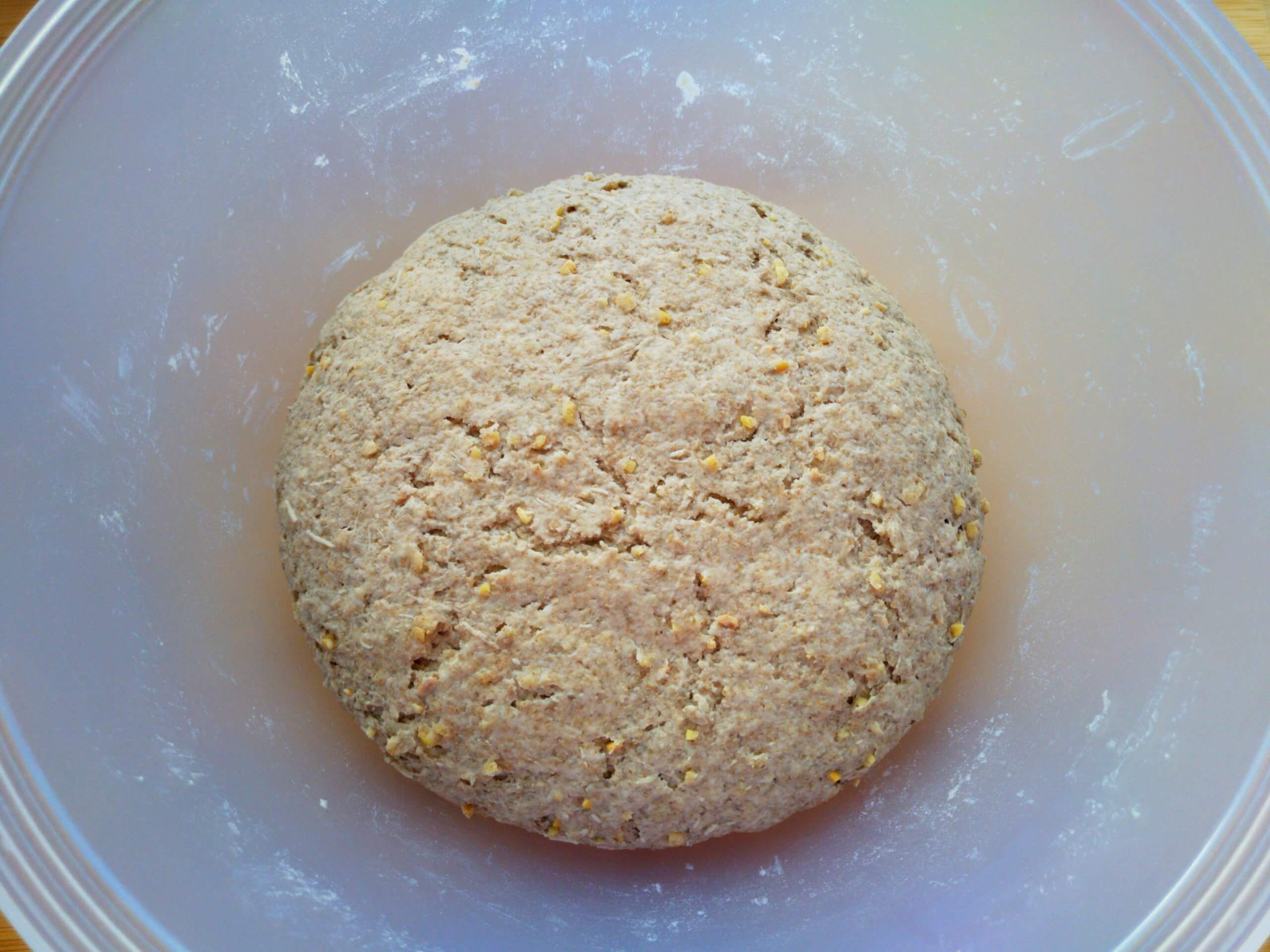 Trockene Zutaten in einer Schüssel vorlegen und vermischen. Hefe in lauwarmem Wasser auflösen und zur Mehlmischung gießen. Etwas von der Mehlmischung darüberstäuben und 10 min stehen lassen.