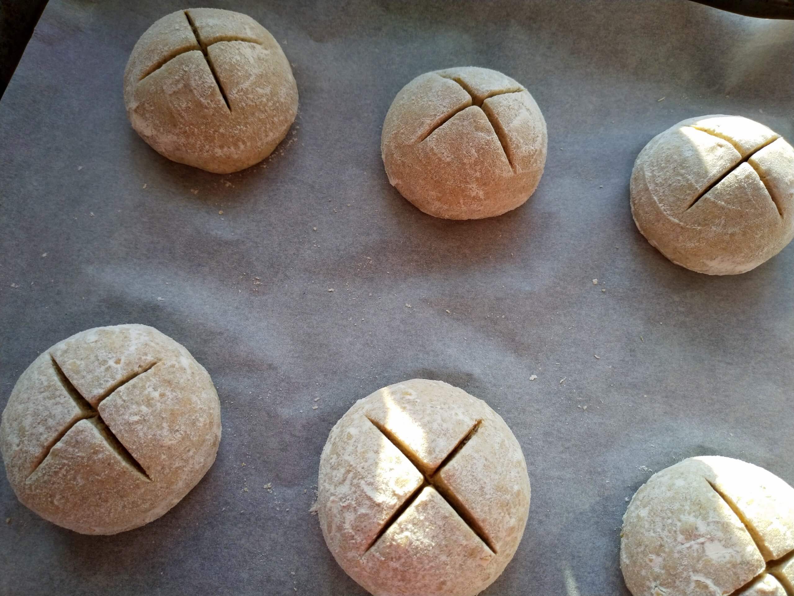 Einschneiden und in der Wärme nochmal 20-25 min gehen lassen. Währenddessen Wasserdampf im Ofen erzeugen, dazu Wasserschälchen auf den Boden stellen.