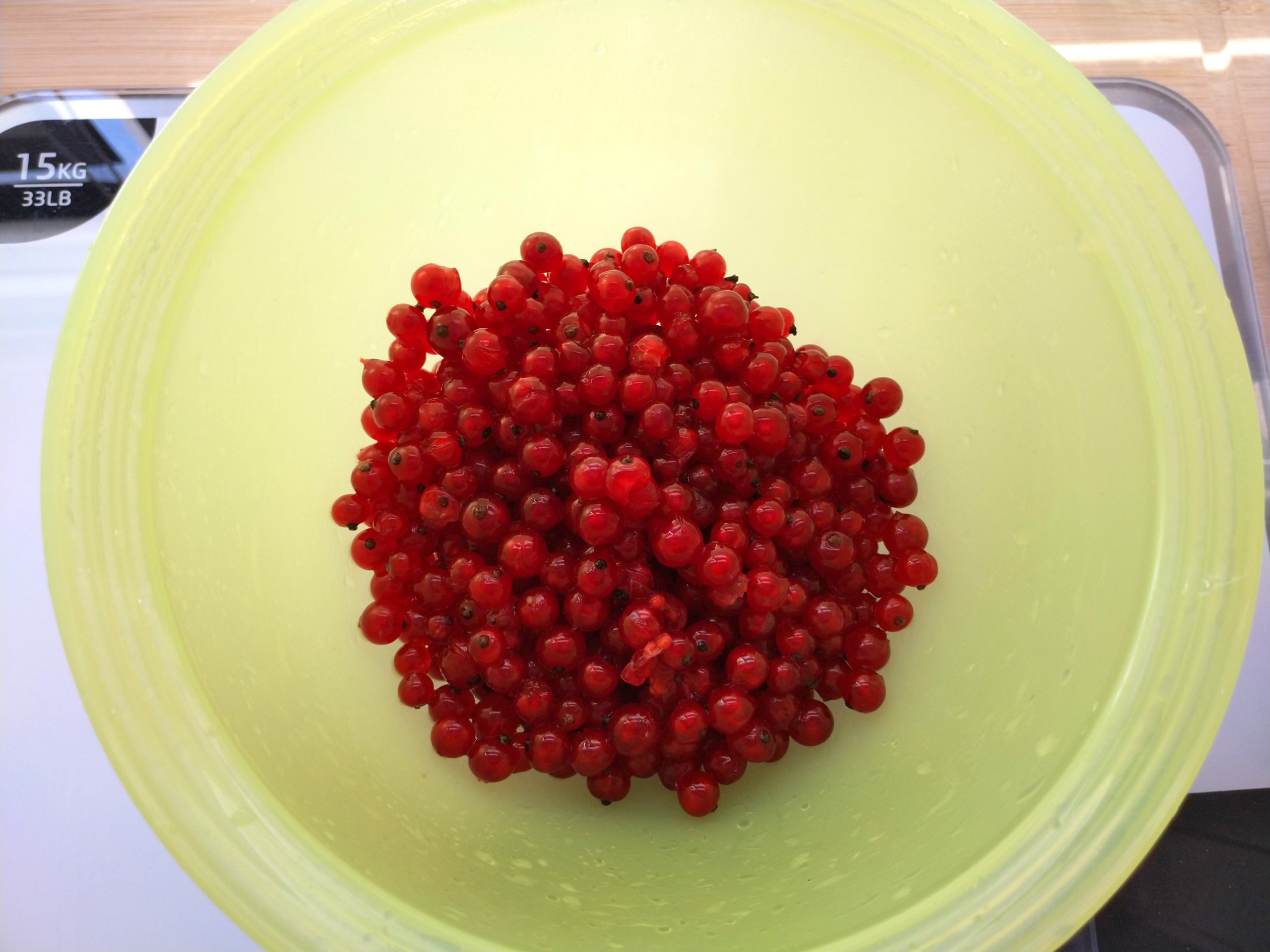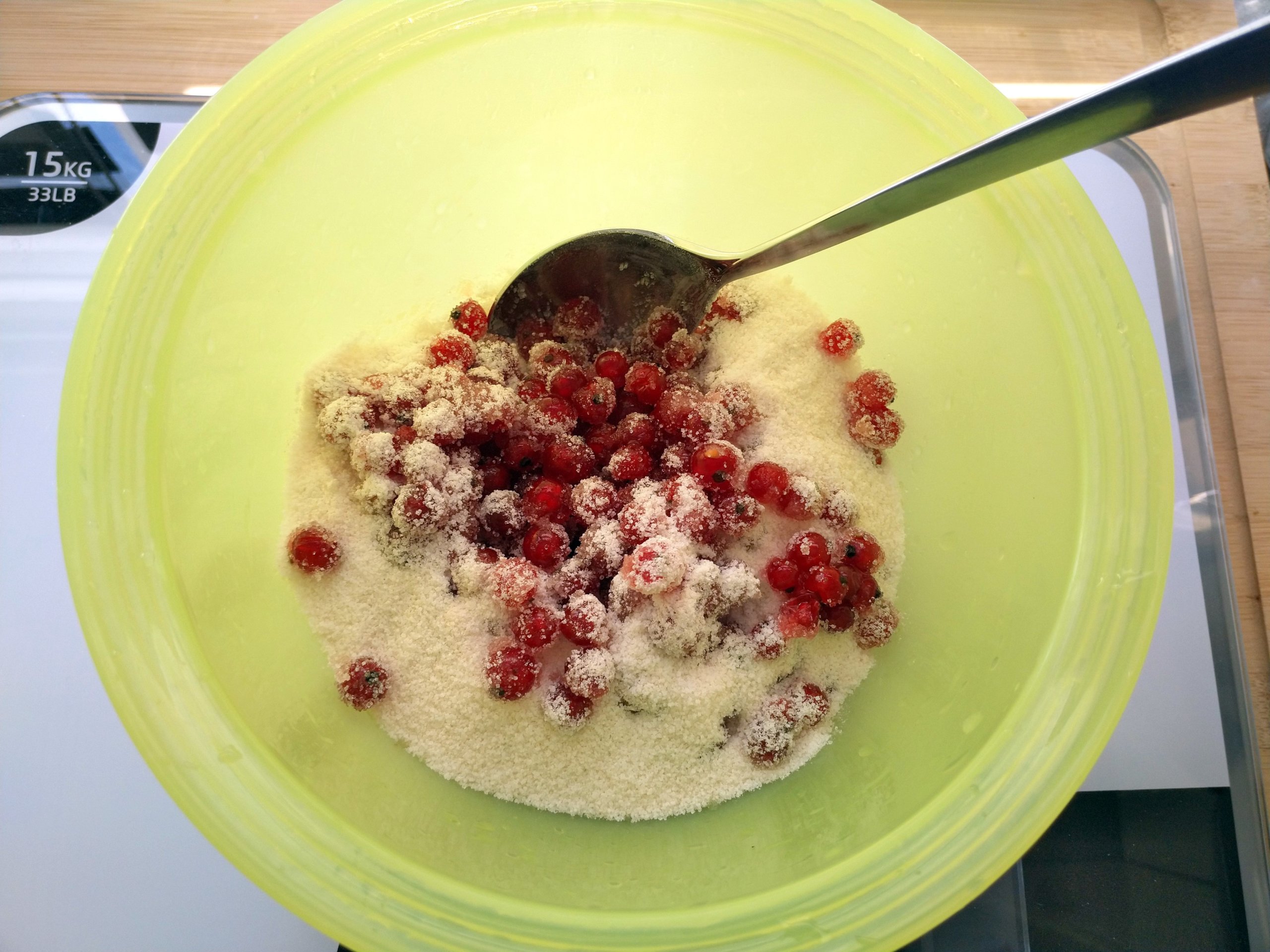 Johannisbeeren waschen und die Stängel entfernen. Mit Gelierzucker vermischen und 1 h ziehen lassen.