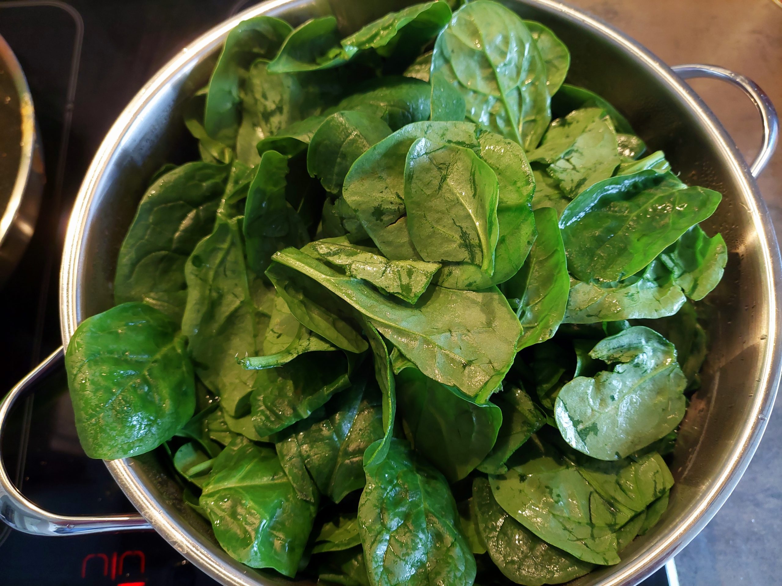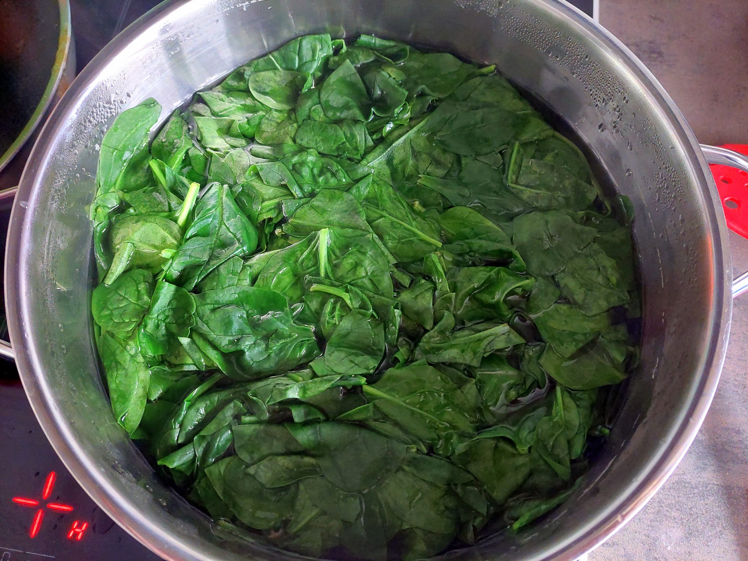 Während die Nudeln etwas antrocknen, den Spinat waschen. Ich blanchiere noch ganz gerne, weil die Menge an Spinat nicht in meinen Saucentopf passt. Dazu in einem großen Topf 3-4 l Wasser erhitzen. Wenn das Wasser fast kocht, den Herd ausstellen und den Spinat hineingeben. 1-2 min im Wasser lassen, umrühren, dann abgießen.