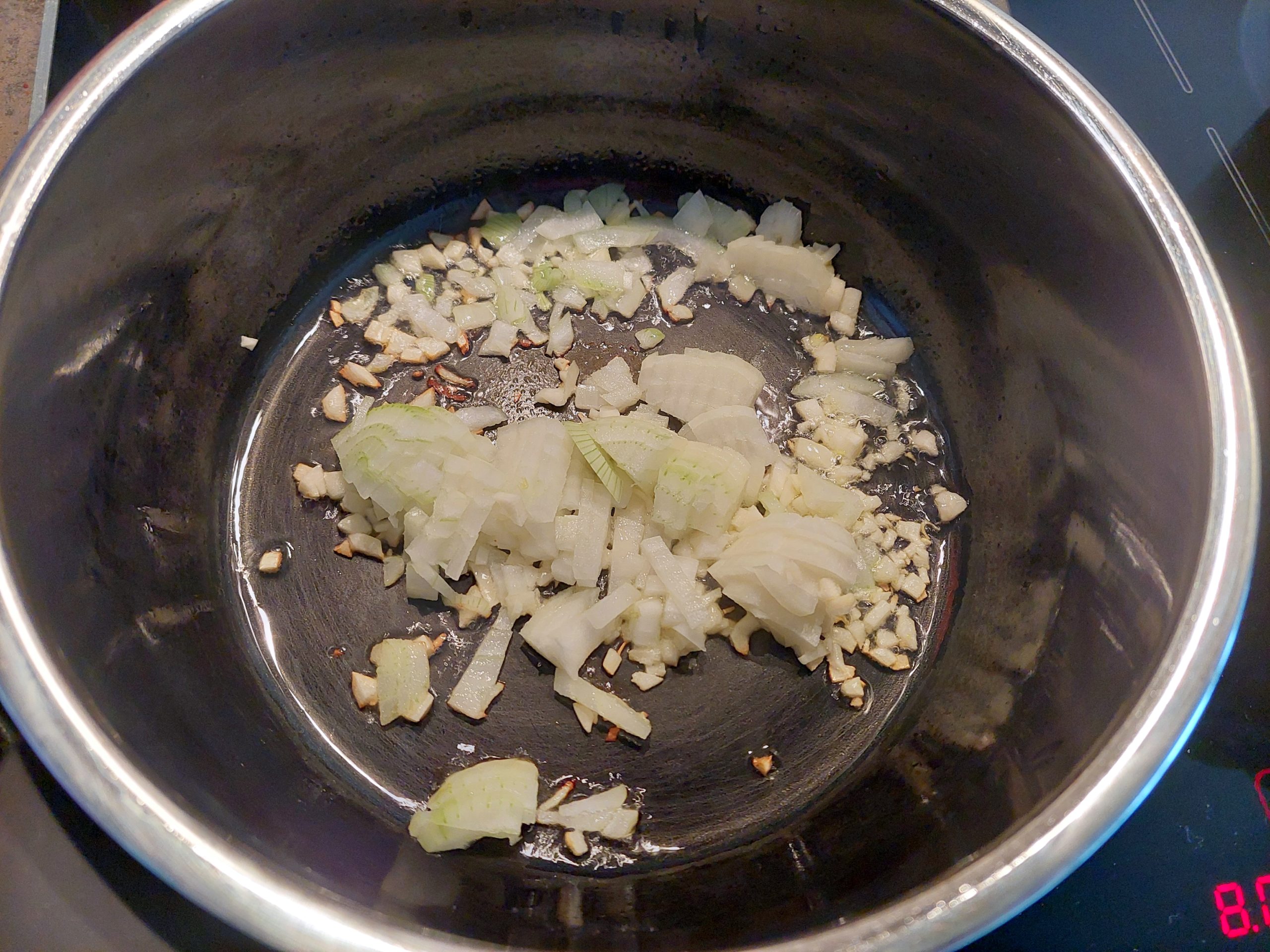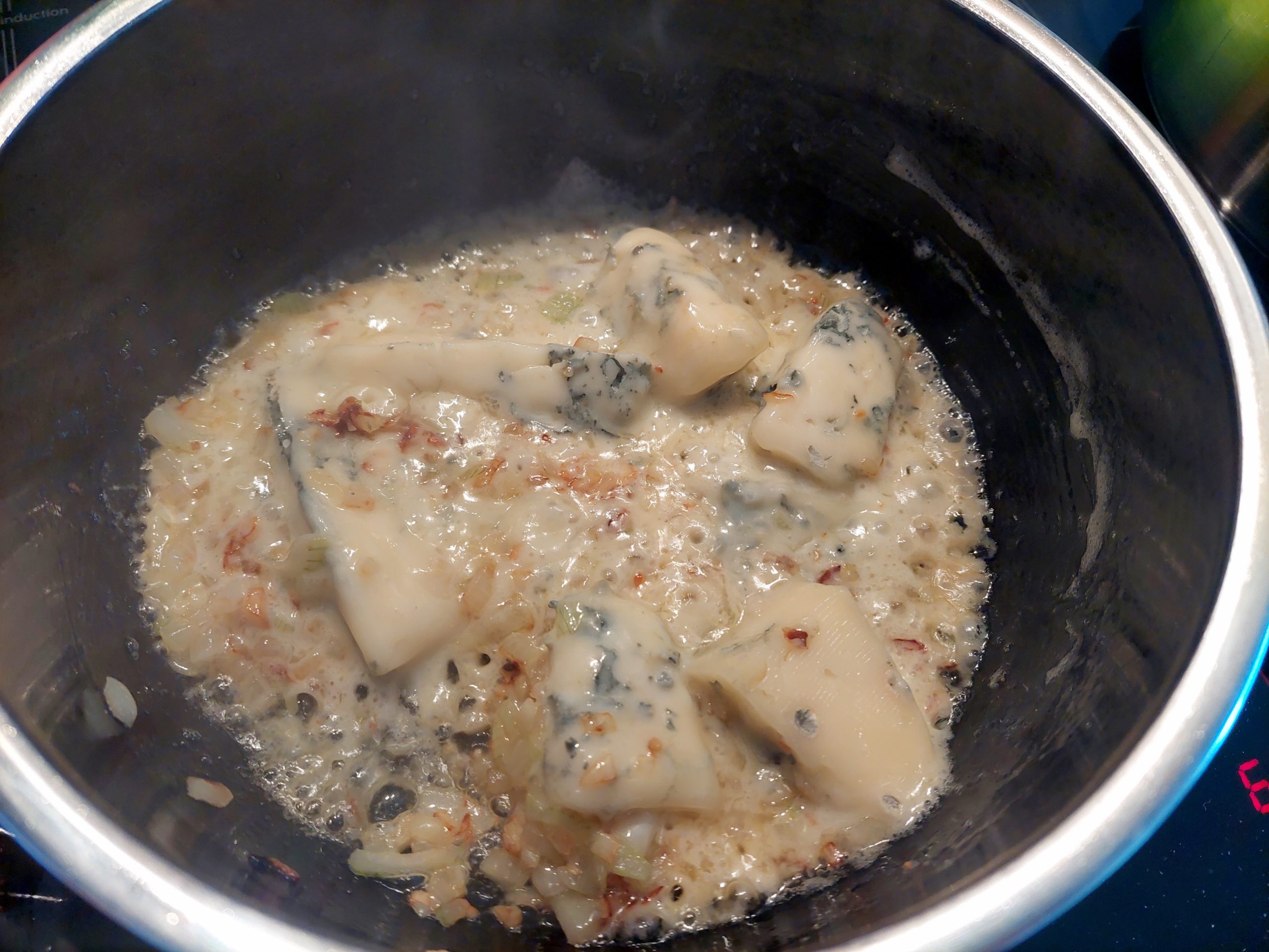 Die Zwiebel in feine Würfel schneiden und in etwas Olivenöl glasig andünsten. Den Gorgonzola dazugeben und bei niedriger Temperatur schmelzen lassen.