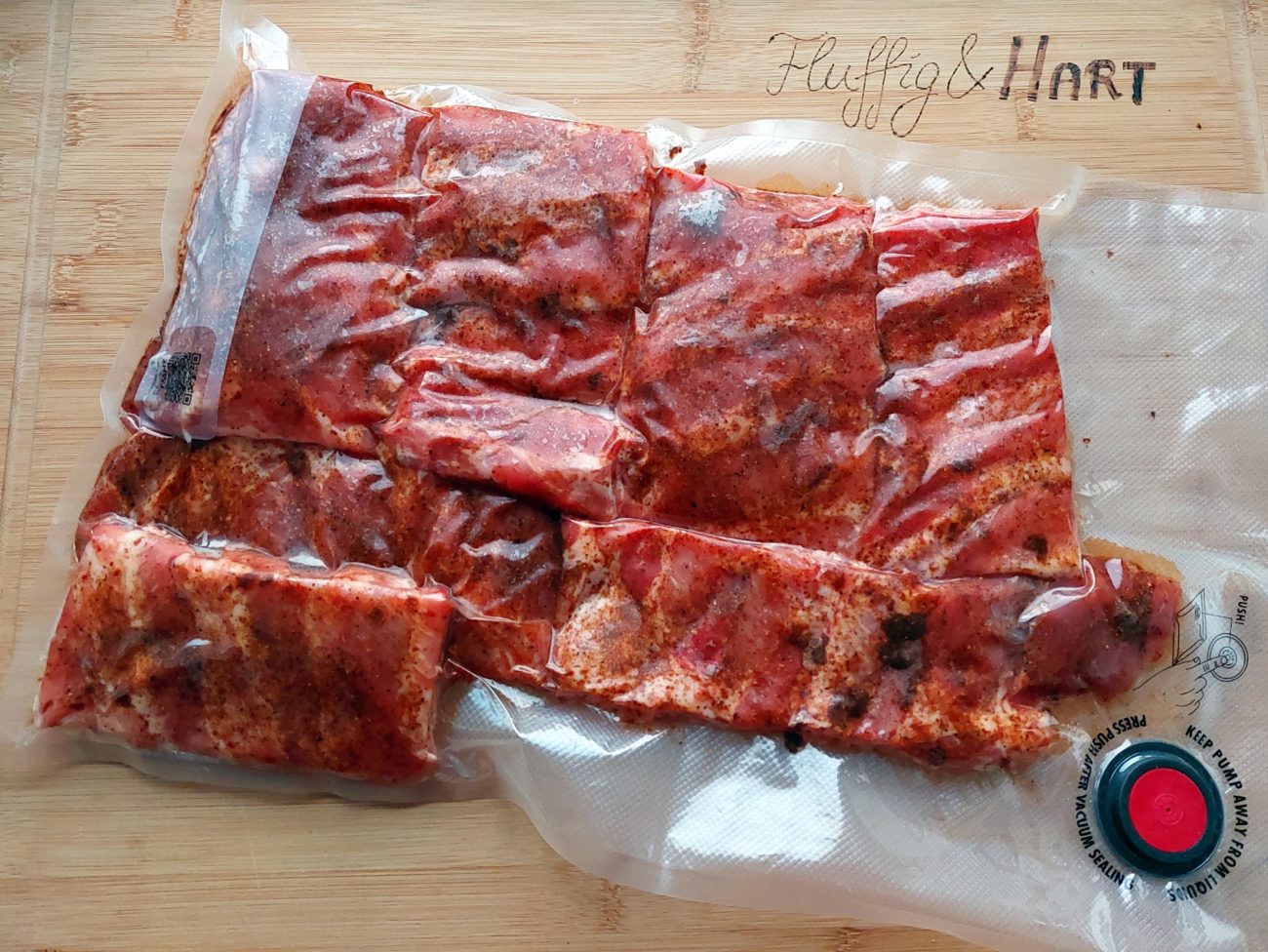 Barbecue Rub in die Spare Ribs gut einmassieren und mind. 12 h ziehen lassen. Ich vakuumiere* mittlerweile sehr gern ein, damit das Fleisch ein intensiveres Aroma erhält.