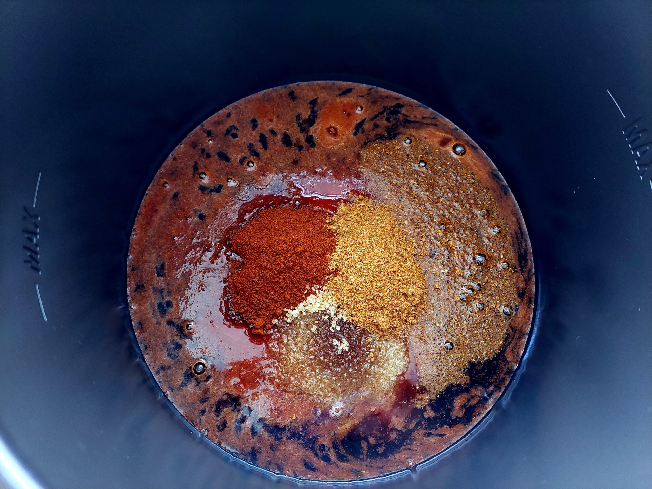 Am nächsten Tag aus Cola, Ketchup und Gewürzen eine Sauce im Cook4Me-Topf anrühren.