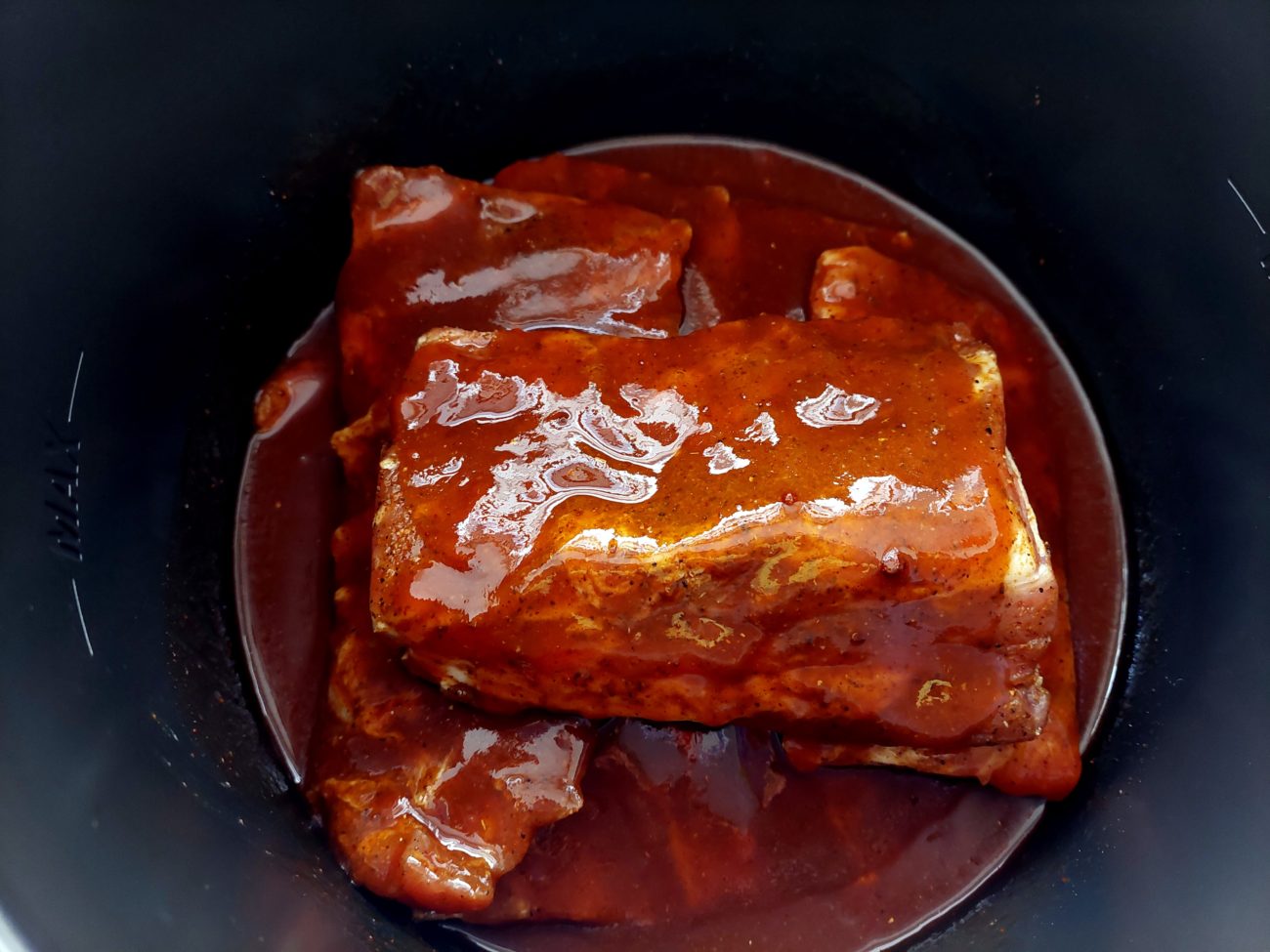Zuerst müssen die Spare Ribs gegart werden, damit das Fleisch zart wird und sich nachher gut vom Knochen löst. Dazu werden die Rippchen in einer Sauce aus Cola, Ketchup und Barbecuegewürz unter Druck gegart. Anschließend müssen die Rippchen noch mit einer Schicht Sauce mit dem ExtraCrisp-Deckel* glasiert werden und schon sind die Spare Ribs aus der Cook4Me fertig.