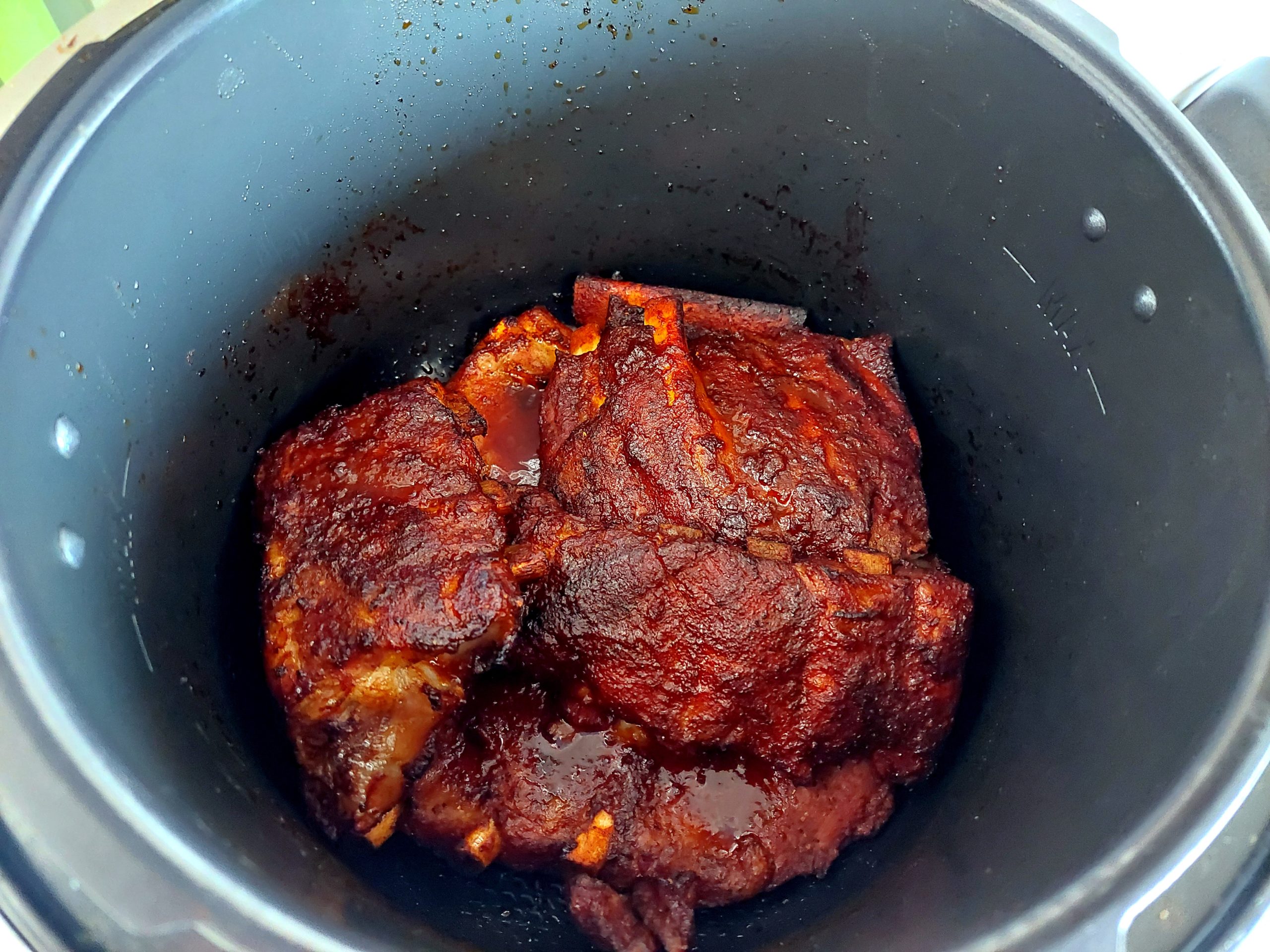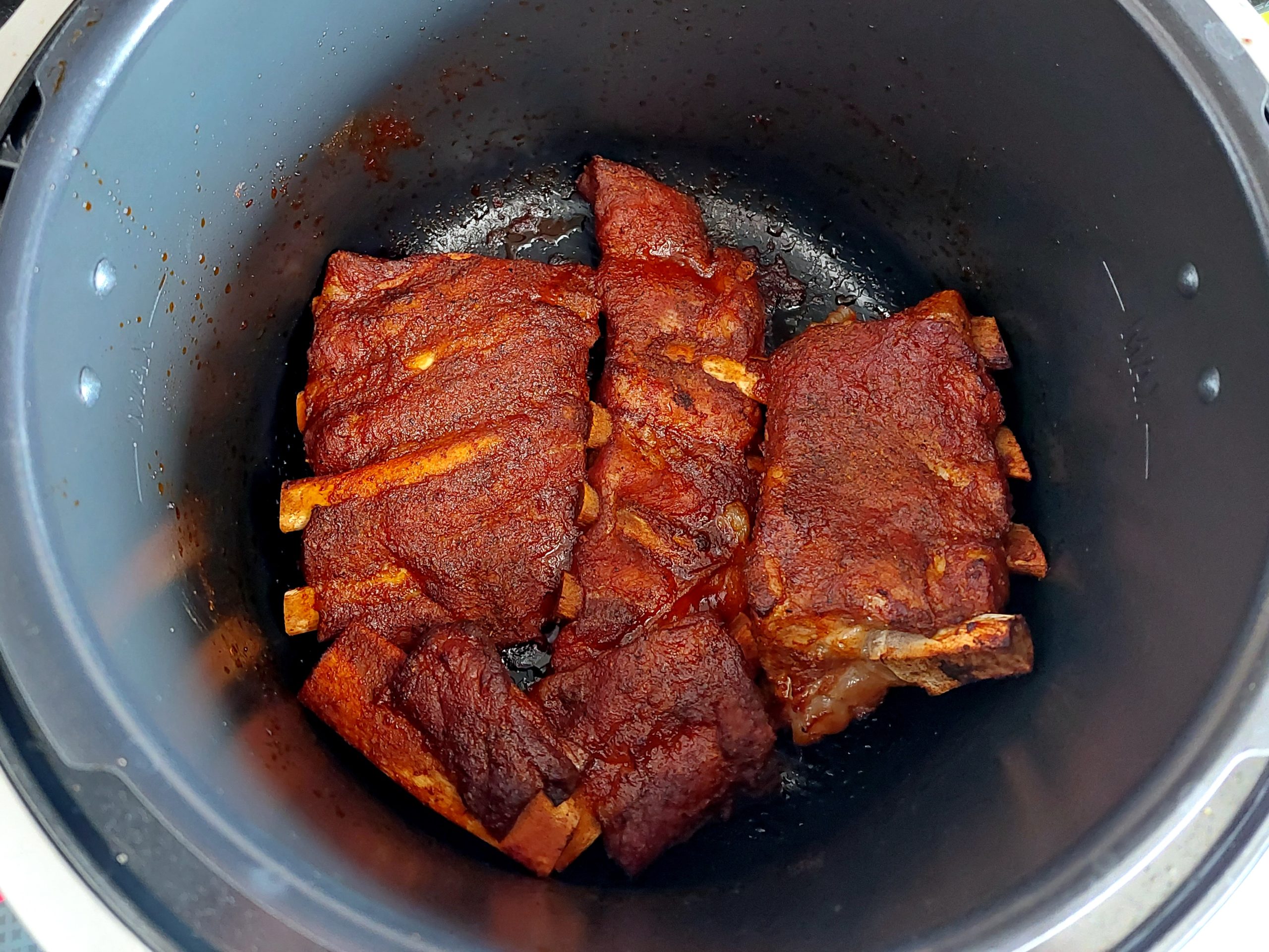 Zum Abschluss nochmal alle Spare Ribs in den Topf geben und 5 min mit dem ExtraCrisp-Deckel* auf Hitze bringen.