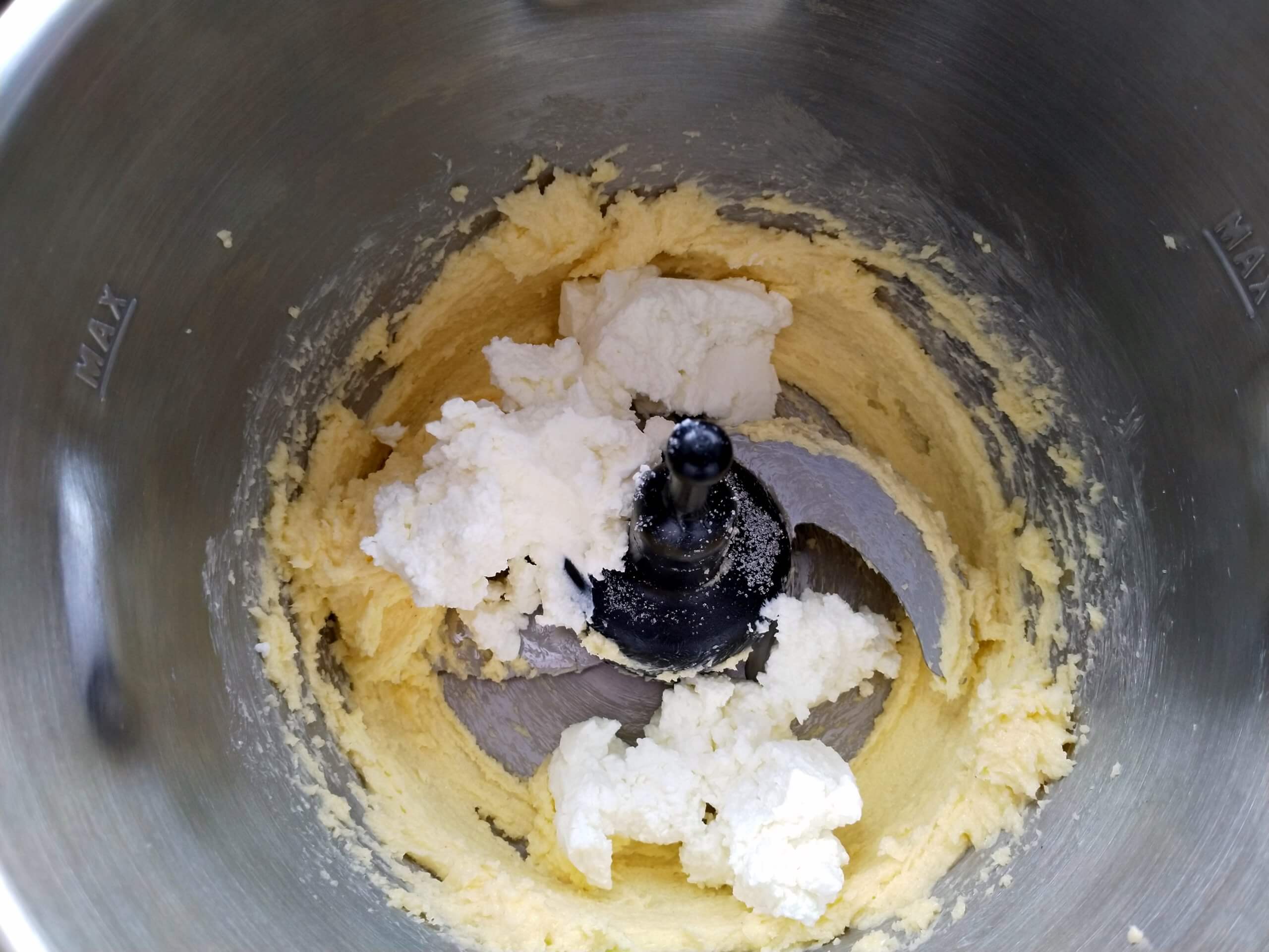 Butter, Zucker und Ei schaumig rühren. Anschließend den Quark mit den gemahlenen Mandeln untermischen.