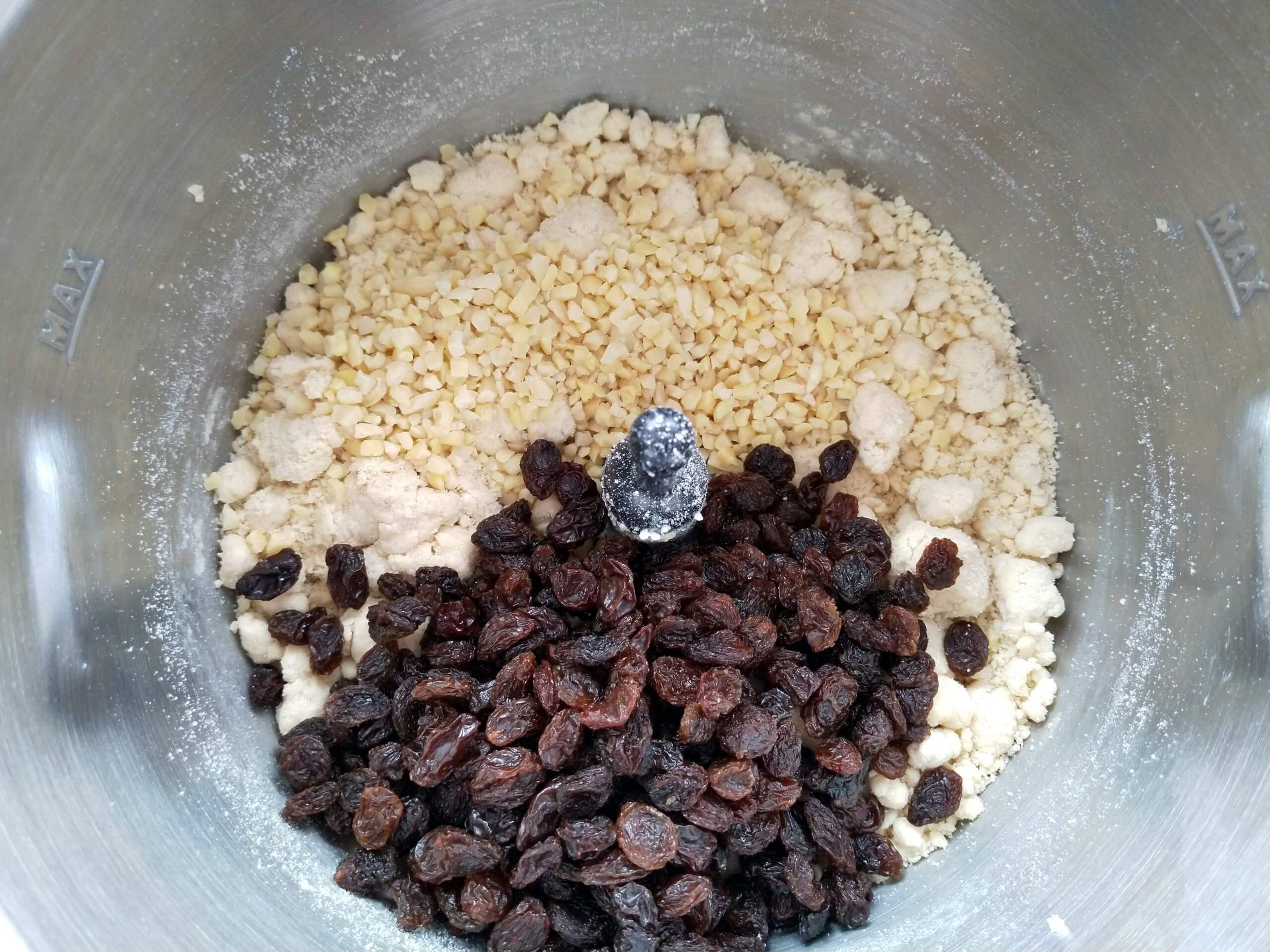 Bei Verwendung der Prep&Cook das Mehl mit dem Backpulver darüberstäuben und auf Stufe 5 für 2min kneten. Zum Schluss die Rosinen mit den gehackten Mandeln dazugeben, auf Stufe 4 stellen und durch die Deckelöffnung den Grand Marnier hinzugießen.