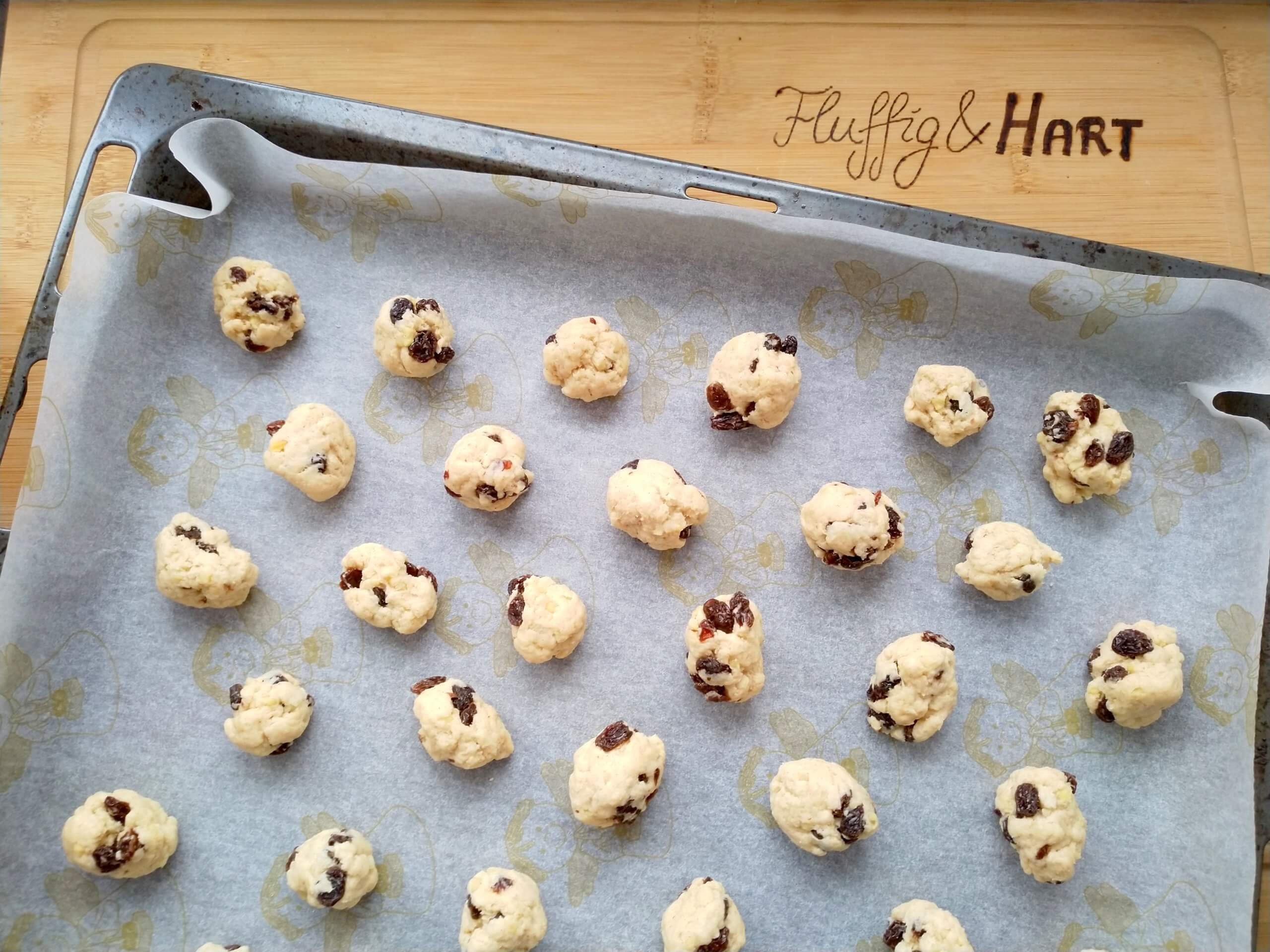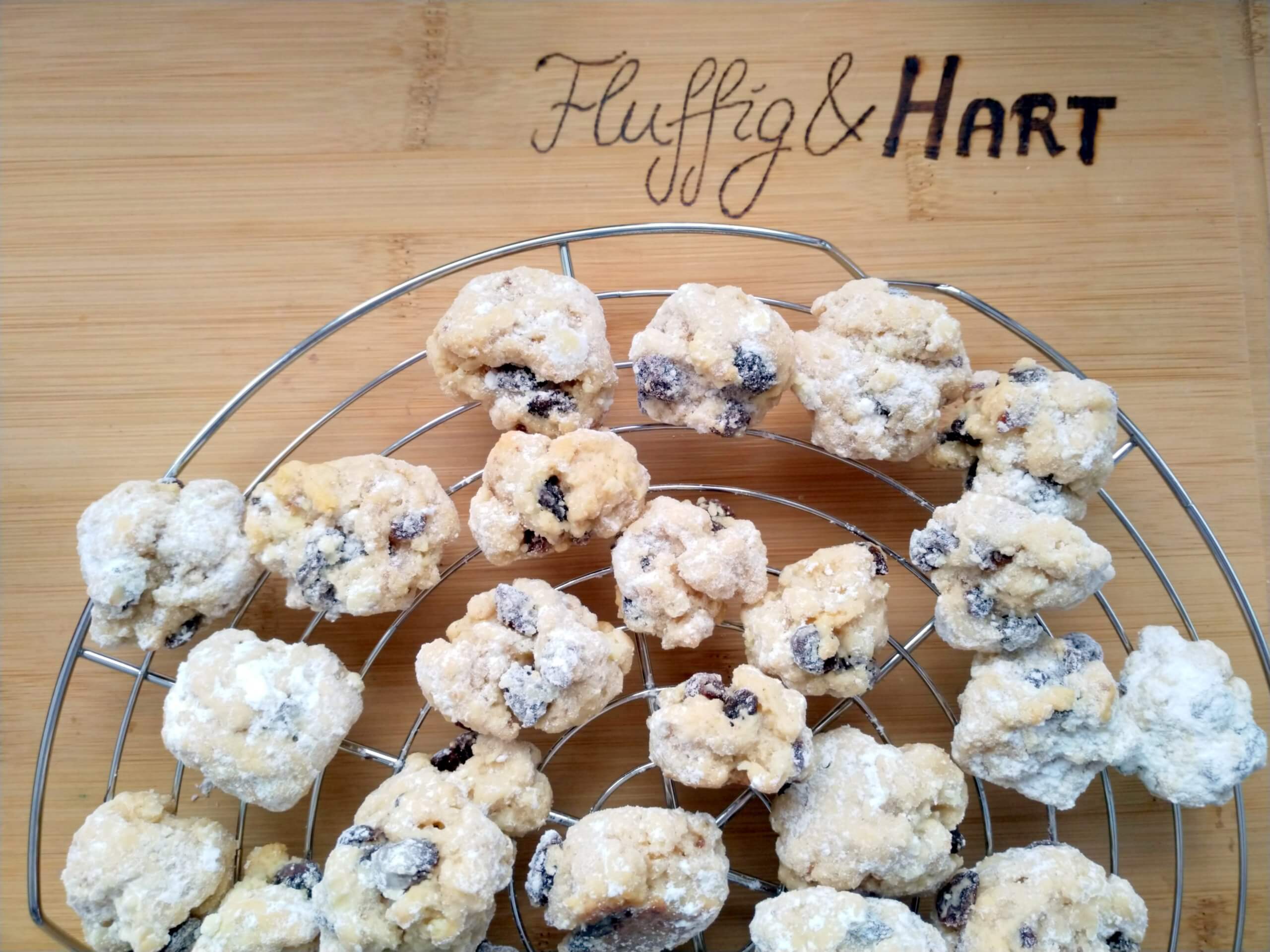 So lange kneten, bis ein geschmeidiger Teig entstanden ist, der sich von der Schüssel löst. Anschließend kleine Bällchen formen und auf ein Blech legen. Die Bällchen dürfen ruhig etwas unförmig sein, das gibt nachher Abwechslung. Bei 180°C Ober-/Unterhitze ca. 15 min backen. Das Stollenkonfekt sollte dabei möglichst hell bleiben.