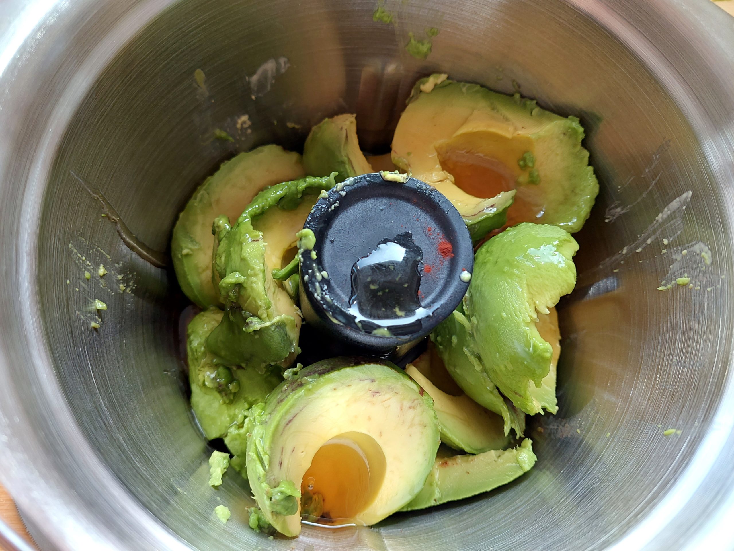 Bei Verwendung der Prep&Cook die Minischüssel einsetzen und das Fruchtfleisch der Avocado mit dem Agavendicksaft hineingeben. Erst auf Stufe 10 für 1 min pürieren, dann auf Stufe 12 nochmals 1 min.