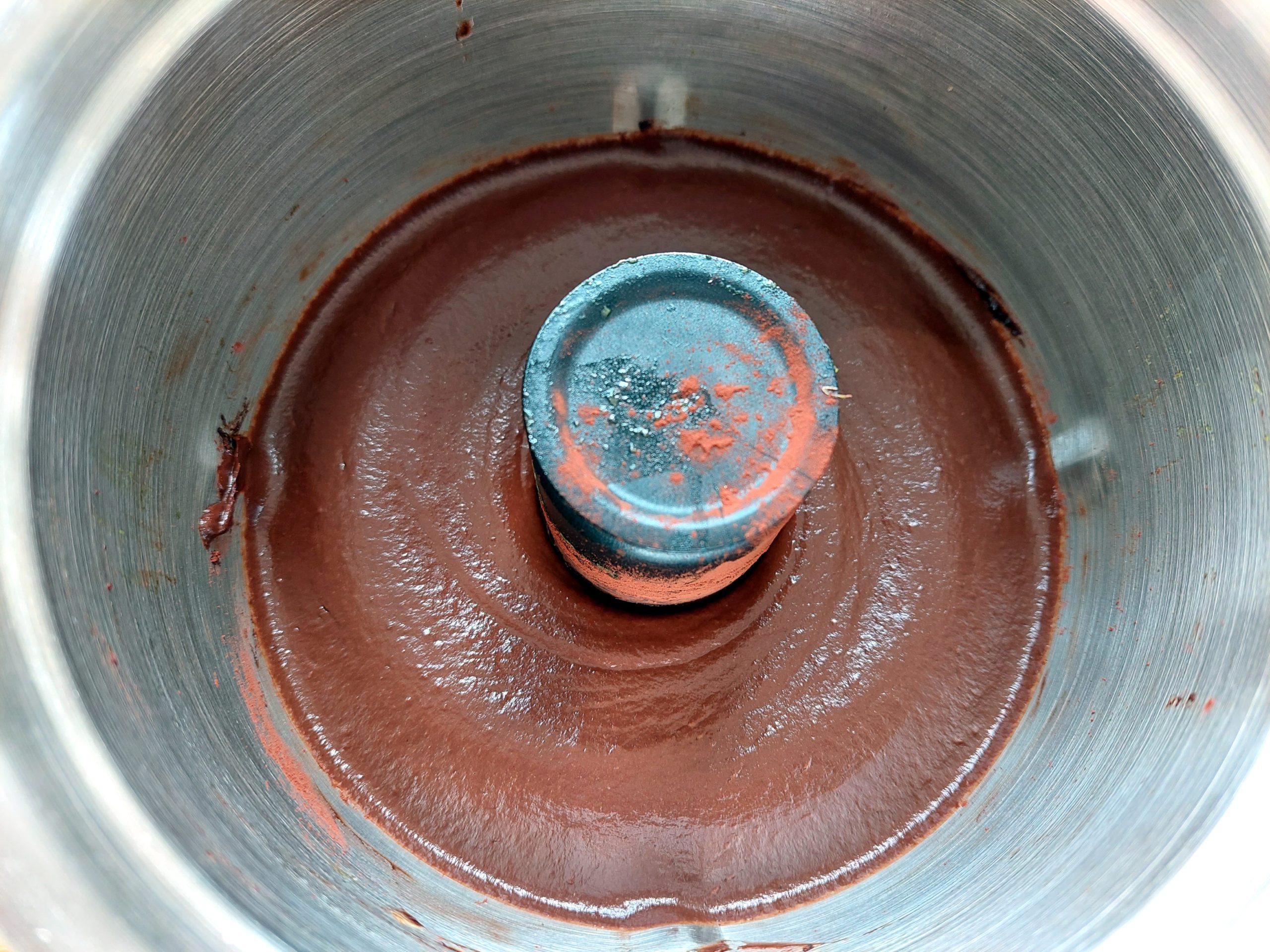 2. Hafermilch mit Kakao dazugeben und mit einem Löffel durchmischen. Anschließend mit dem Pürierstab luftig aufschlagen.