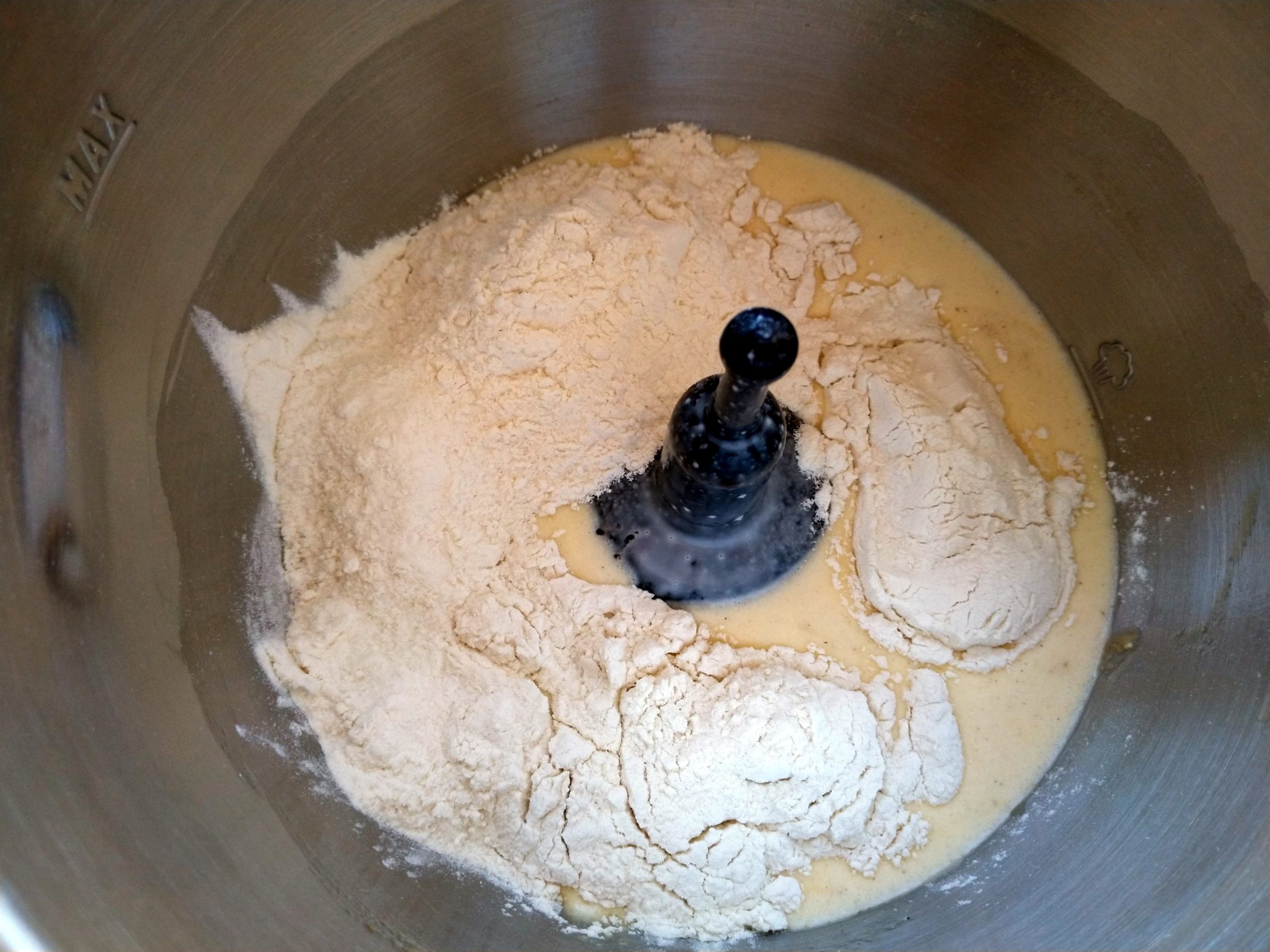 Bei Verwendung der Prep&Cook das Mehl über die Masse stäuben und auf Stufe 4 stellen. Durch die Deckelöffnung die Sahne langsam eingießen. Auf Stufe 5 stellen und 1min rühren.