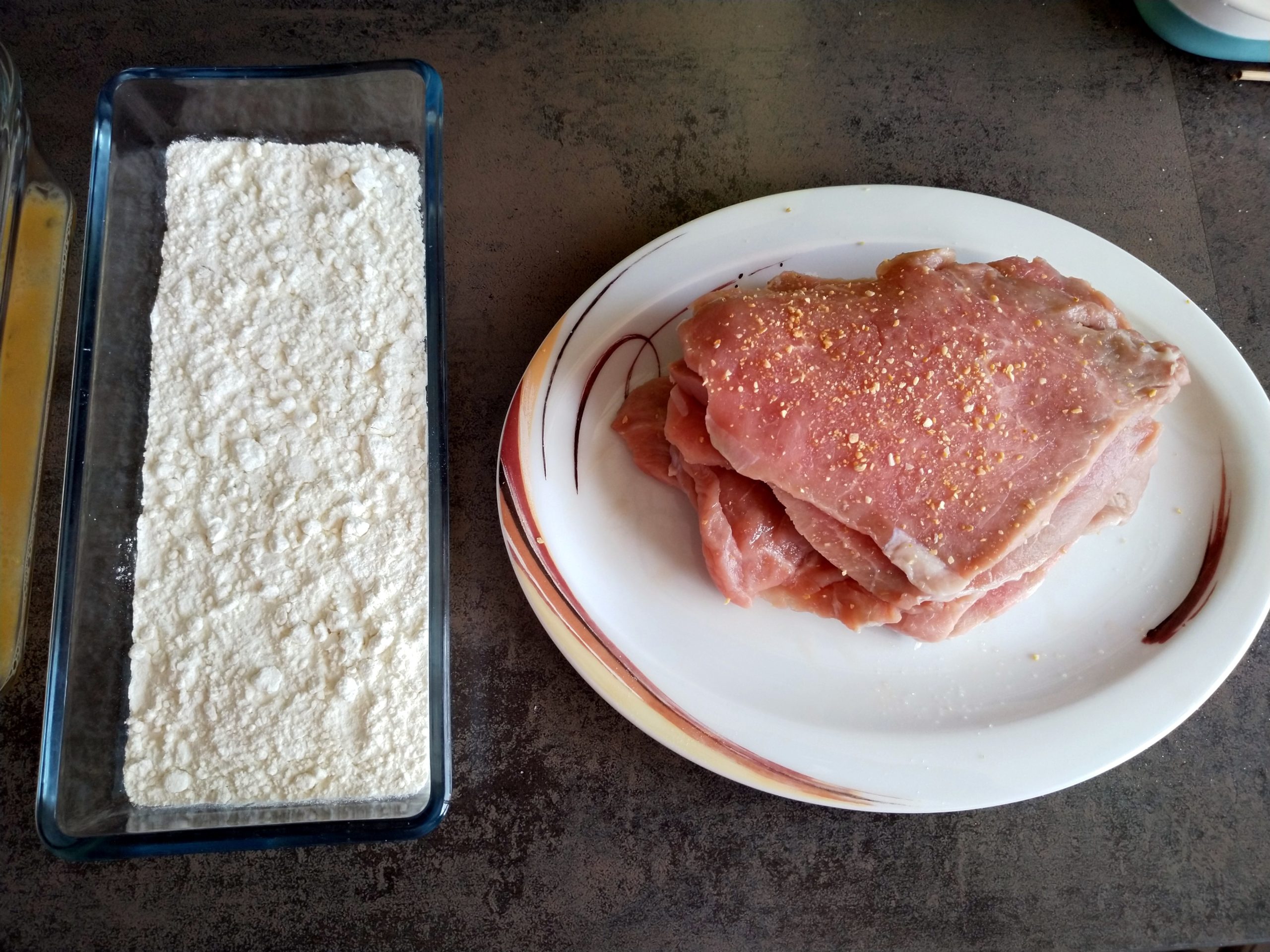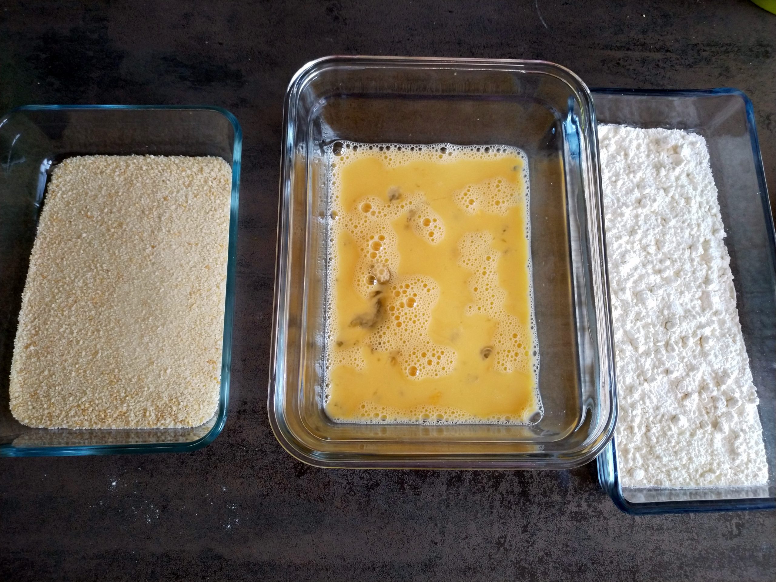 2. In je eine längliche Schale Mehl, die verquirlten Eier und die Semmelbrösel einfüllen und nebeneinander hinstellen. Plus einen Teller, auf den man die fertig panierten Schnitzel legen kann.