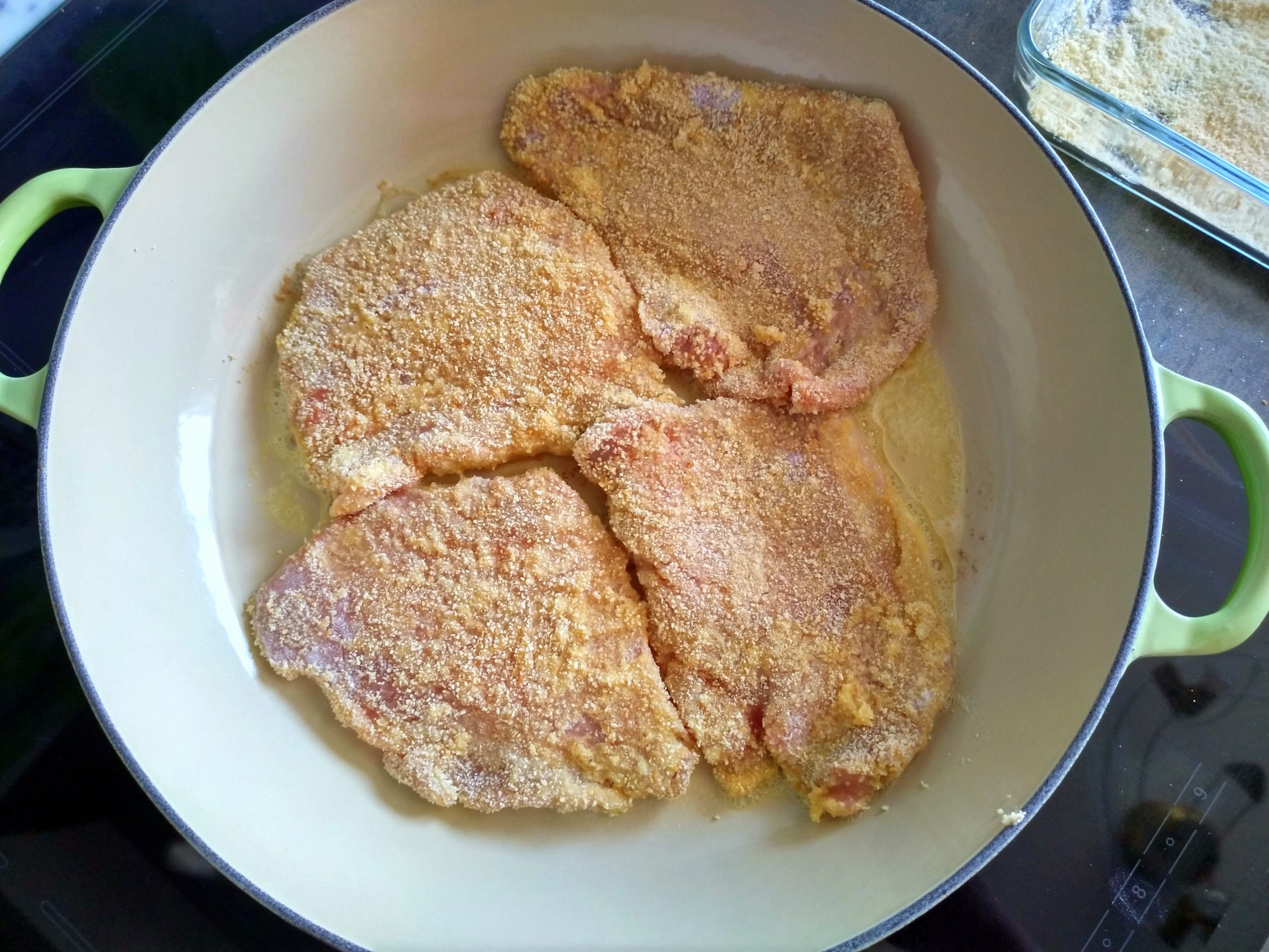 4. Sobald alle Schnitzel in der Pfanne sind, auf mittlerer Hitze langsam garen. Ist die Pfanne zu heiß, brennt die Panade an und das Schnitzel ist noch nicht durch, ist sie zu kalt wird die Panade pampig.