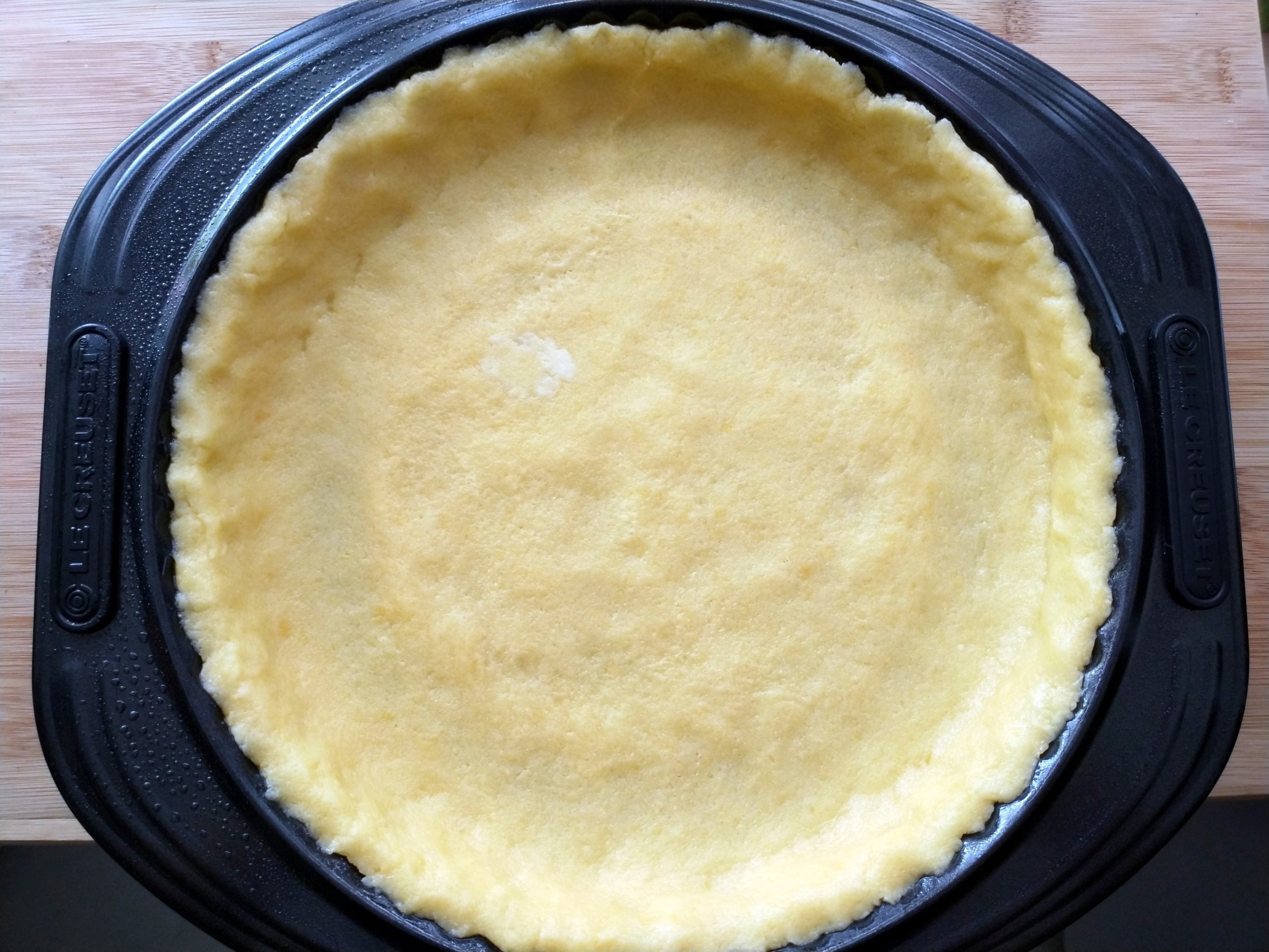 1. Im vorgeheizten Backofen blind backen. D.h. den Teigboden beschweren, damit er nicht so stark nach oben aufgeht. Auskühlen lassen.