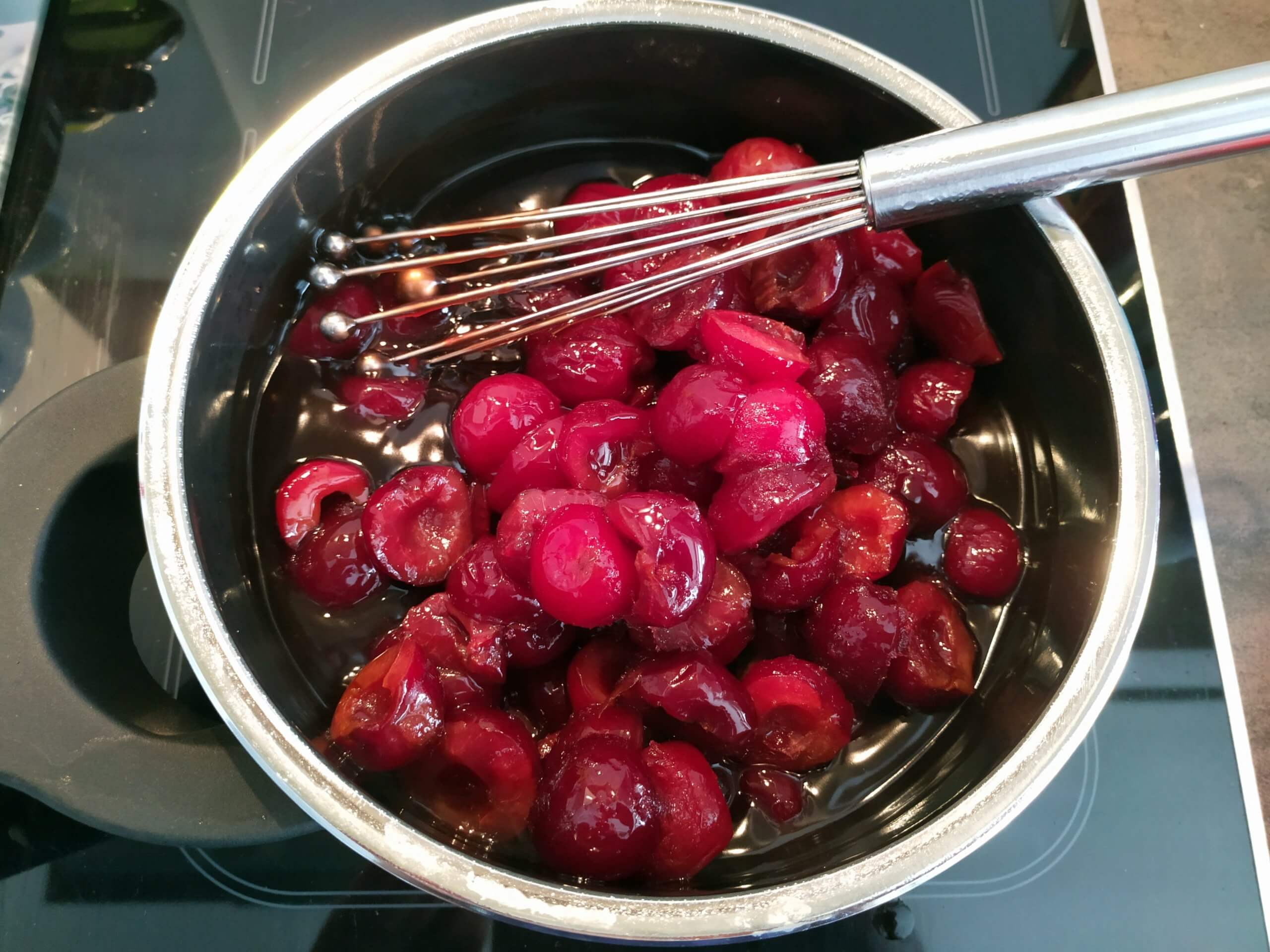 Kirschen entsteinen oder aus dem Glas abtropfen lassen. Ca. 30ml Kirschsaft mit der Speisestärke und Balsamico anrühren, den restlichen Kirschsaft mit dem Zucker aufkochen. Vom Herd nehmen und Balsamico-Stärke-Mischung unterrühren. Die Flüssigkeit muss richtig eindicken, evtl. auch nochmal aufkochen. Zum Schluss die Kirschen hineingeben, umrühren und abkühlen lassen.