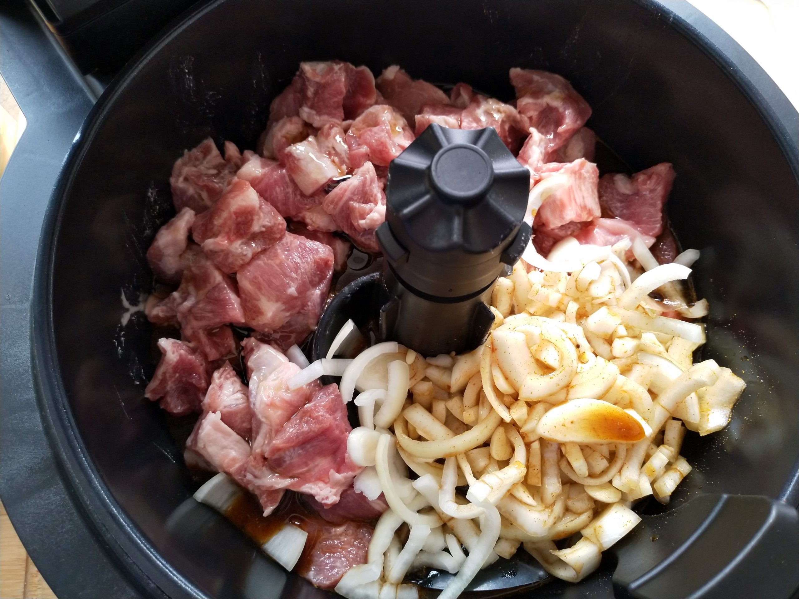 2. Fleisch in die Tefal ActiFry-Schüssel geben, daneben die Zwiebeln und den Knoblauch. Alles mit der Sauce übergießen und im Programm 8 für 30min garen. Den Lauch klein schneiden und nach 20min zum Fleisch dazugeben.
