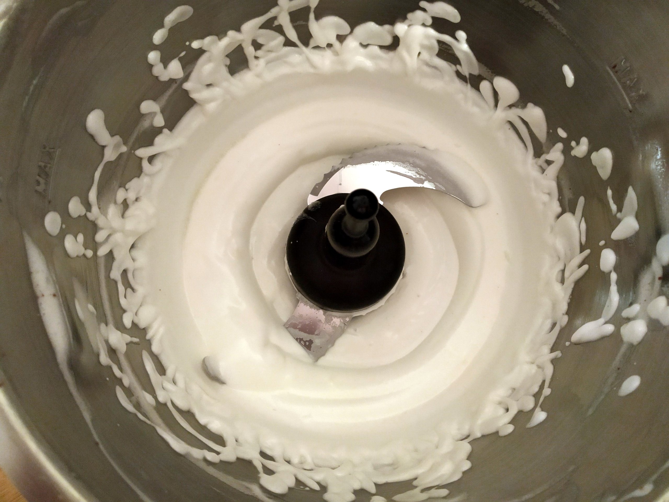 Eiweiß steif schlagen und die Mandel-Schokoladenmischung dazugeben.