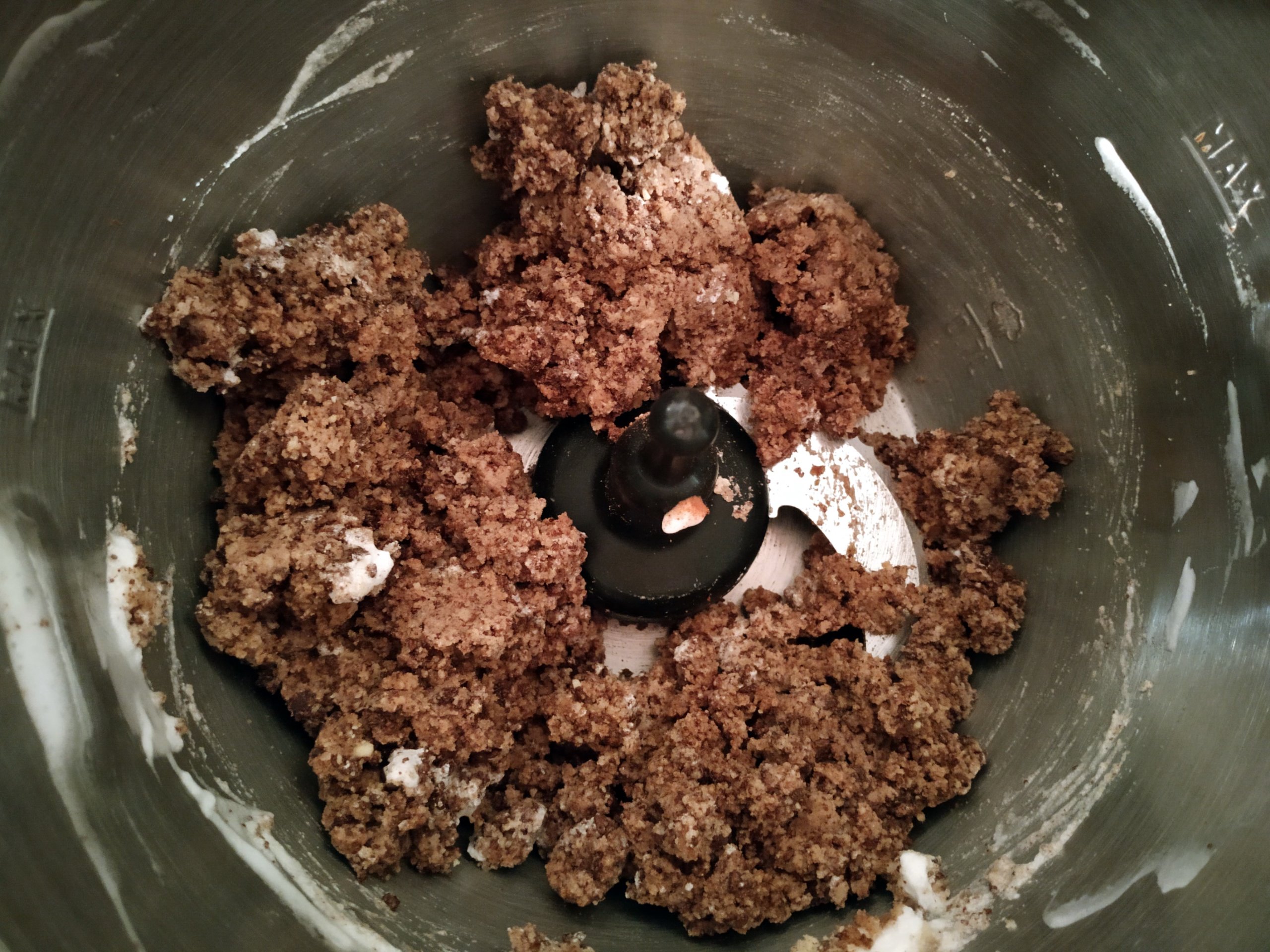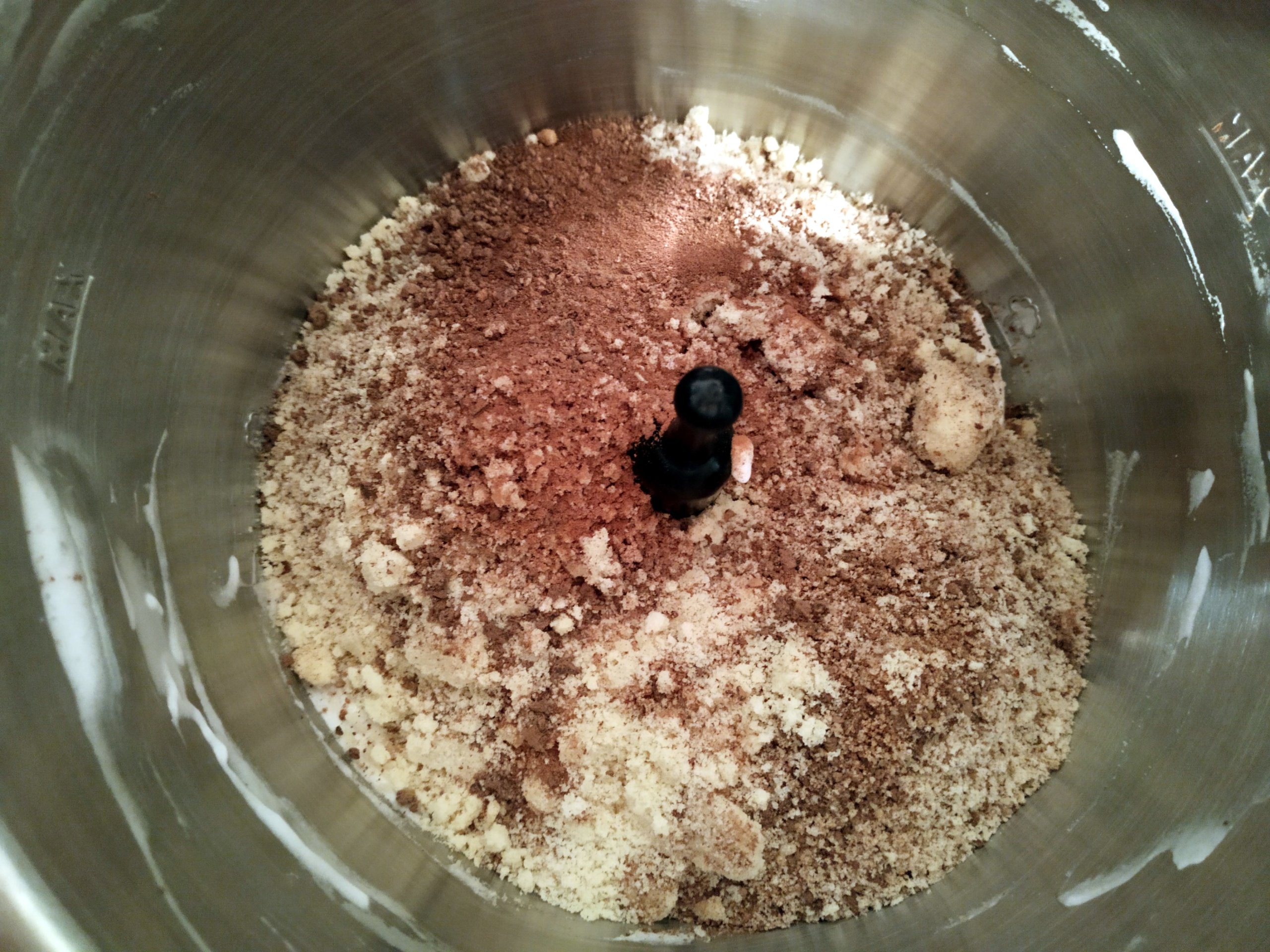 Schokolade in kleine Stücke hacken und mit den Mandeln vermischen. Anschließend im Mixer möglichst fein mahlen.