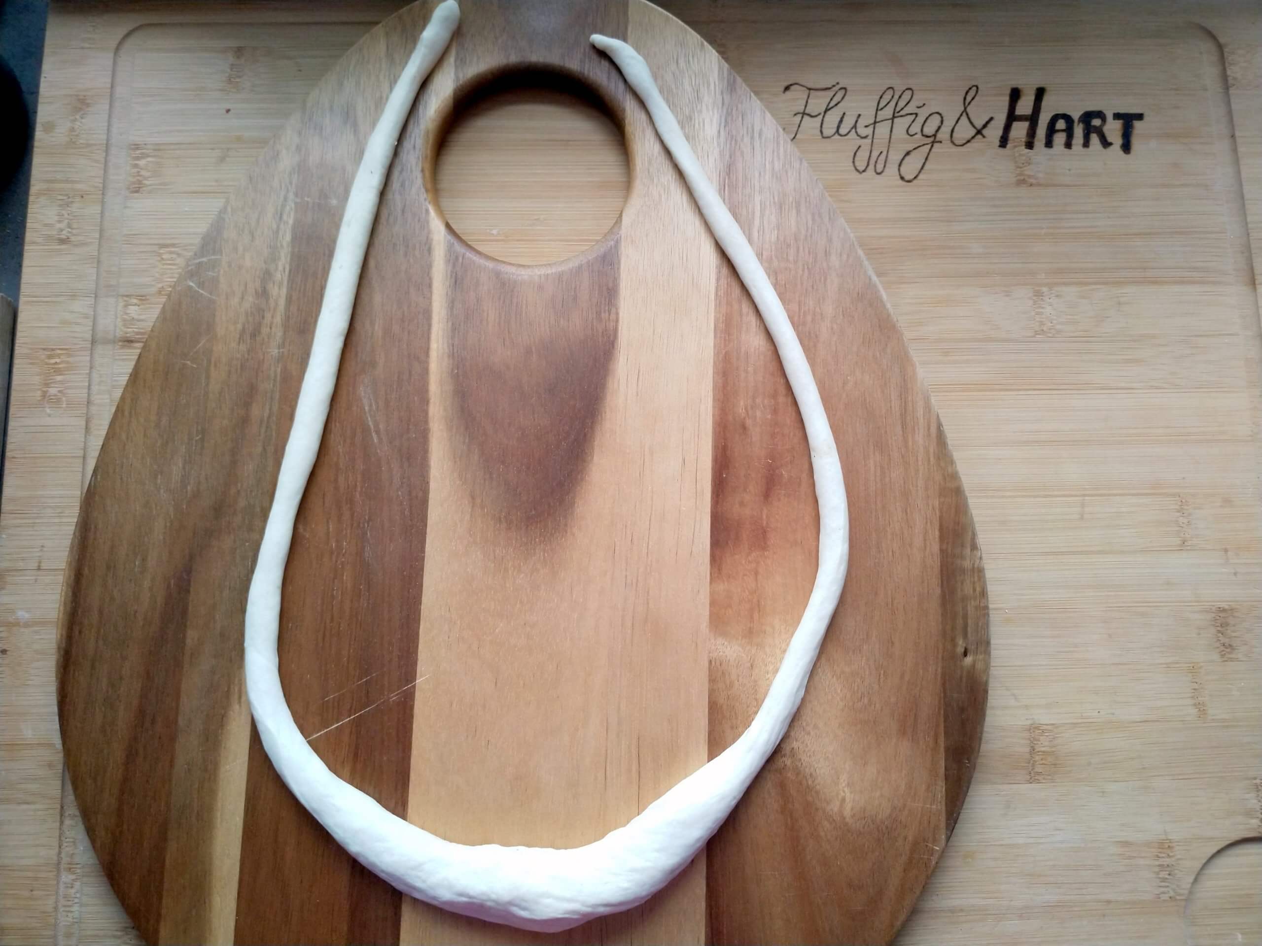 Für eine Brezel einen etwa 50cm langen Strang formen, der in der Mitte dicker ist. Dann die beiden Enden im oberen Drittel zweimal verdrillen und die Enden mit der Verdrillung nach unten klappen.