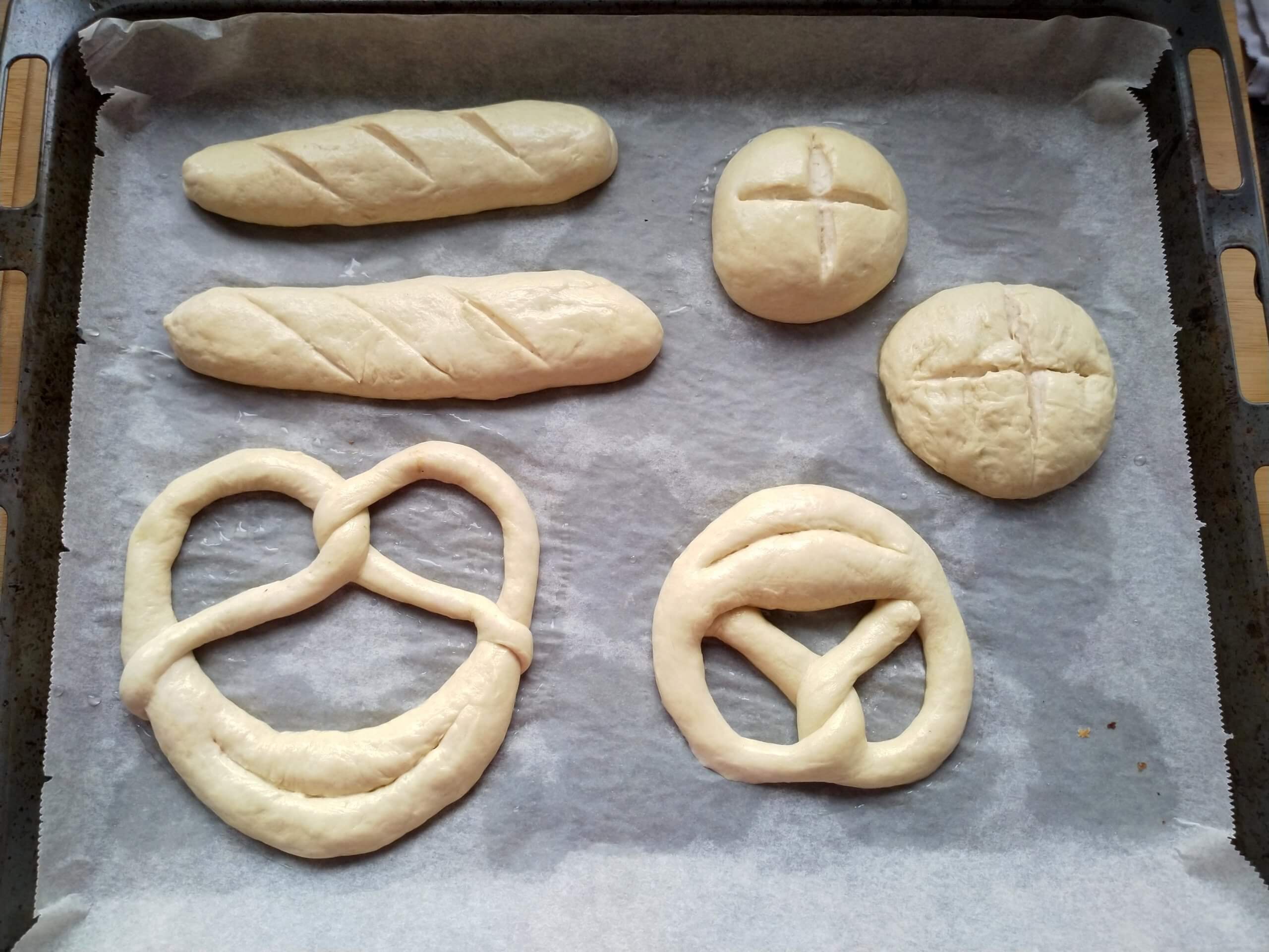 Ofen vorheizen und Dampf erzeugen. Dazu feuerfeste Wasserschälchen in den Ofen stellen. Den Teig noch einmal durchkneten und dann in 6 Teigstücke teilen. Entweder zu Brötchen, Stangen oder Brezeln formen.
