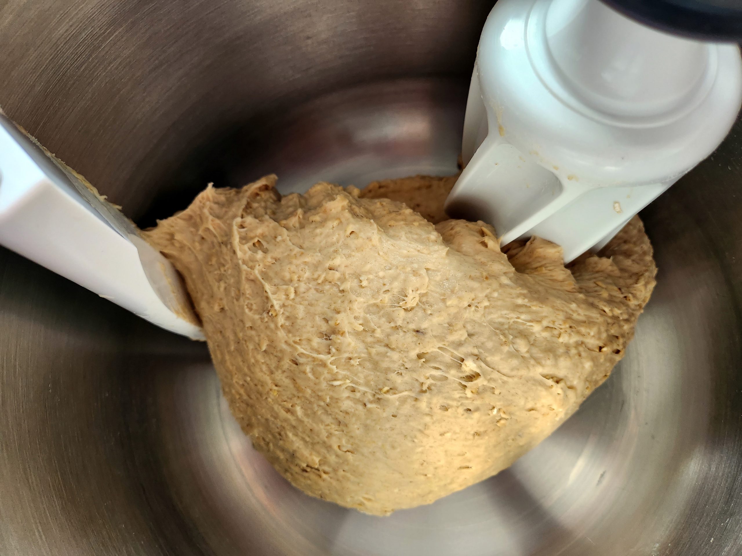 1. Dinkelmehl mit Haferflocken und Salz mischen. Hefe in etwas lauwarmer Hafermilch lösen und zur Mehlmischung geben. Restliche lauwarme Hafermilch dazugeben und alles zu einem geschmeidigen Teig verkneten.