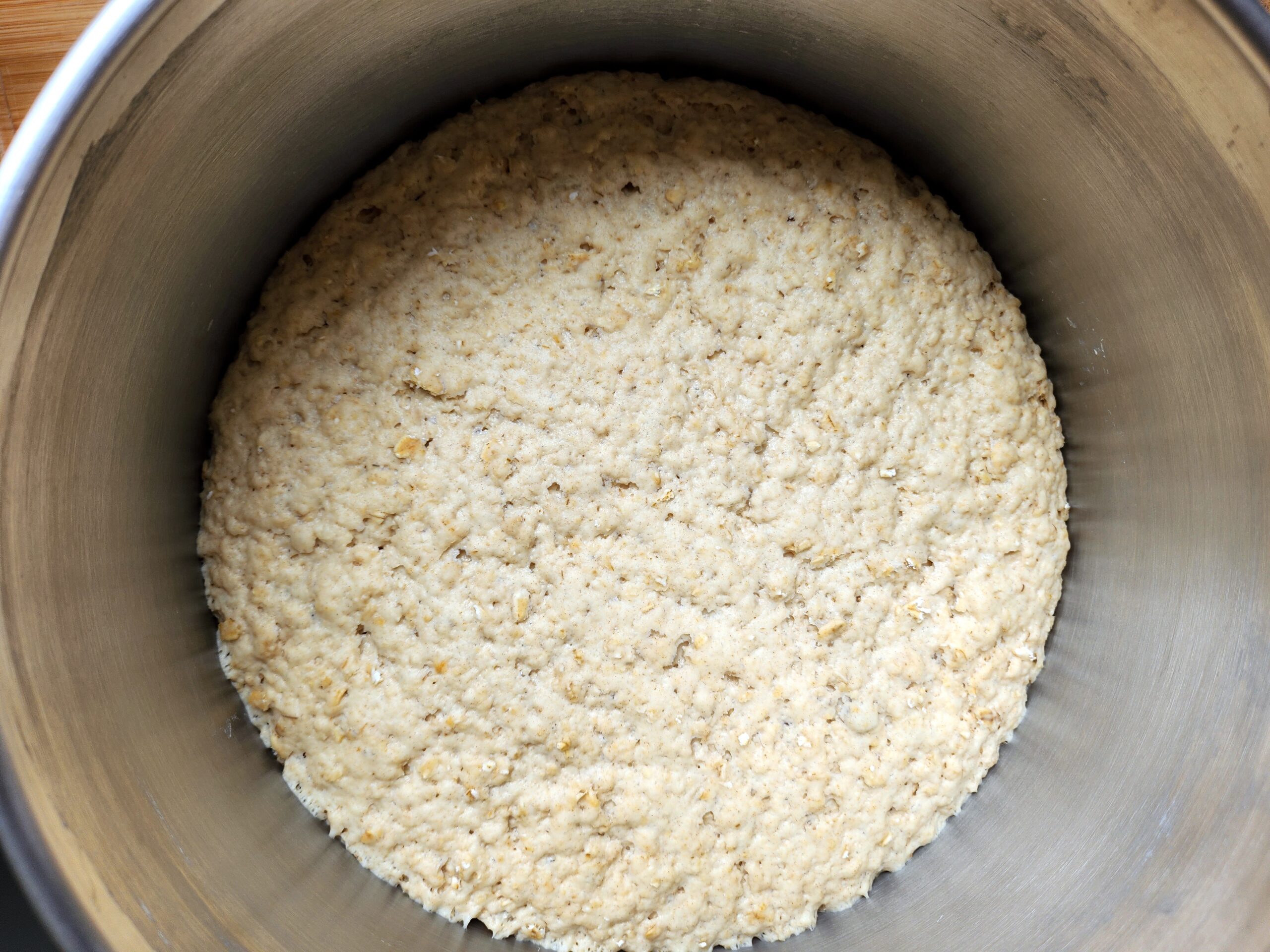 3. Einen Brotlaib formen und in etwas Haferflocken wälzen. Ofen auf 230°C mit gusseisernem Topf vorheizen. Brot in den Topf legen und Ofen auf 200°C zurückstellen. Ca. 1 h mit Deckel backen, anschließend auskühlen lassen.